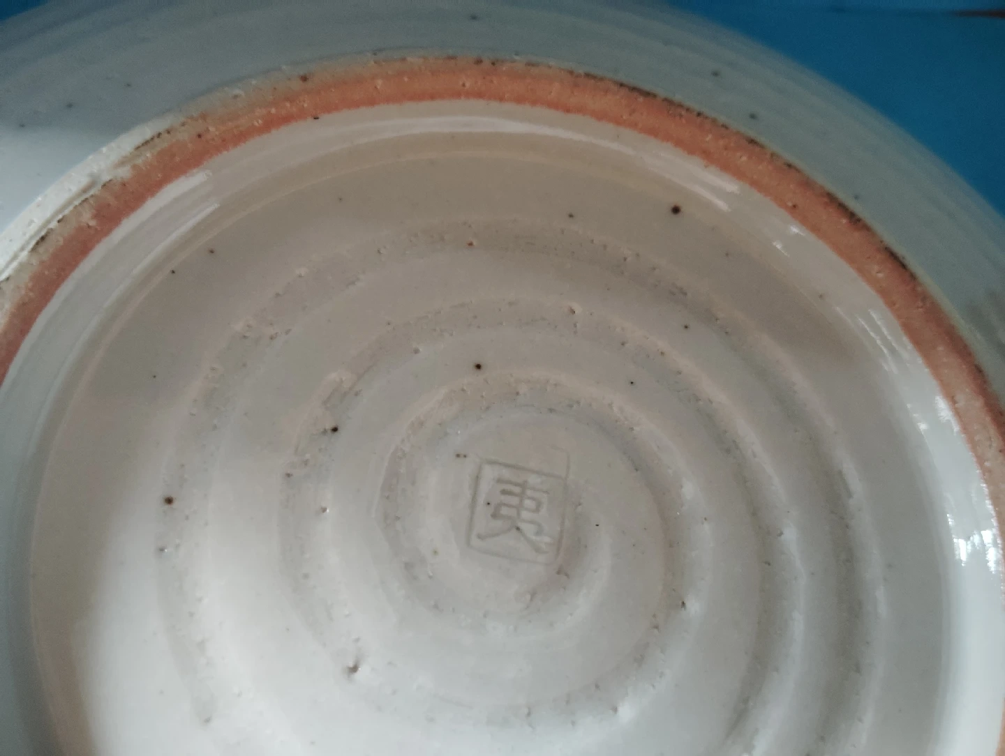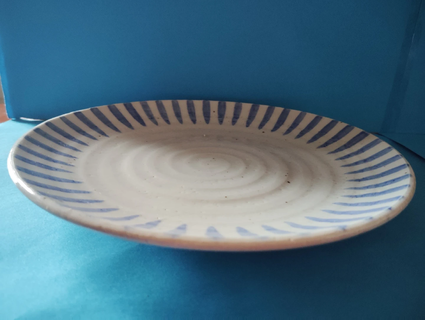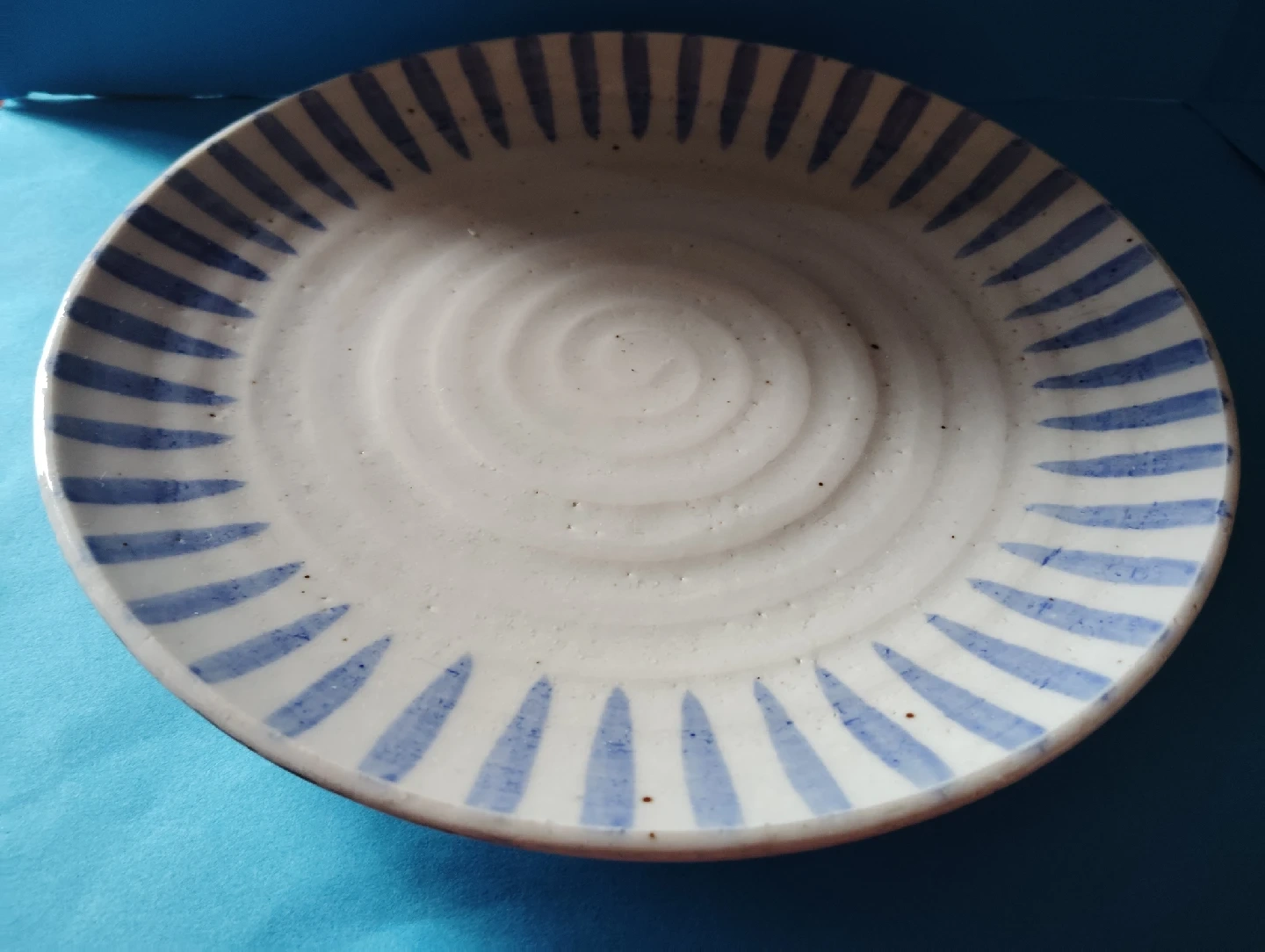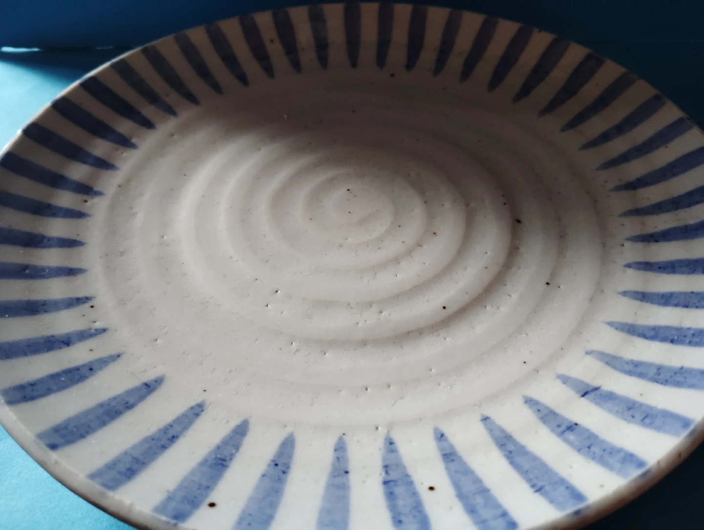 美濃焼 十草 一つ一つ絵付けし焼き上げた器です。 凹凸の渦柄が裏面にまで渦巻く。縁に淡い青色がランダムに線を描く、美しい皿です。 *新品ですが底が茶がかってます。又、工程による黒い点があります。気になる方はお避け下さい。  サイズ(約)径22 高2.2 センチ