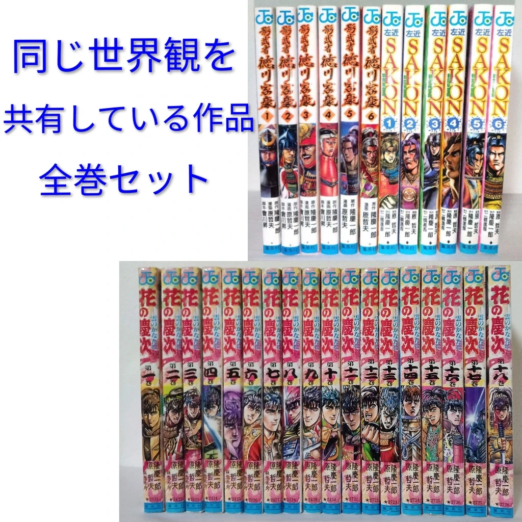 同じ世界観を共有している同作者作品 戦国時代漫画 全巻セット(バラ売り不可) ▼ 左近 SAKON-戦国風雲録-(島左近) 全6巻 初版 やや傷や汚れあり ▼ 影武者 徳川家康 全6巻 重版 やや傷や汚れあり ▼ 花の慶次-雲のかなたに-(前田慶次) 全18巻 1巻のみ重版 傷や汚れあり 合計30冊セット 著者・原哲夫 隆慶一郎 出版社・集英社 ジャンプコミックス JC 書店等の新刊みたく綺麗な本を好む方 神経質な方は、ご遠慮くださいませ。 古本に、ご理解のある方のみご購入下さい。 あくまで中古品なので使用に問題のない程度の多少の傷などはある物とお考え下さい。 古本は、個々様々な状態の物があります 応募券切取り、ヤケ、シミ、汚れ、ヨレ、スレ、折れ、値札、カバー角小傷み、匂い、経年劣化、等 他〜などありますが読むには問題ありません。 ですので、読めれば良いとのお考えの方で よろしくお願いいたします。 当方の出品は読める事のみを前提にして おりますので すり替え防止の為返品交換キャンセル不可の ノークレーム ノーリターンで よろしくお願い致します。