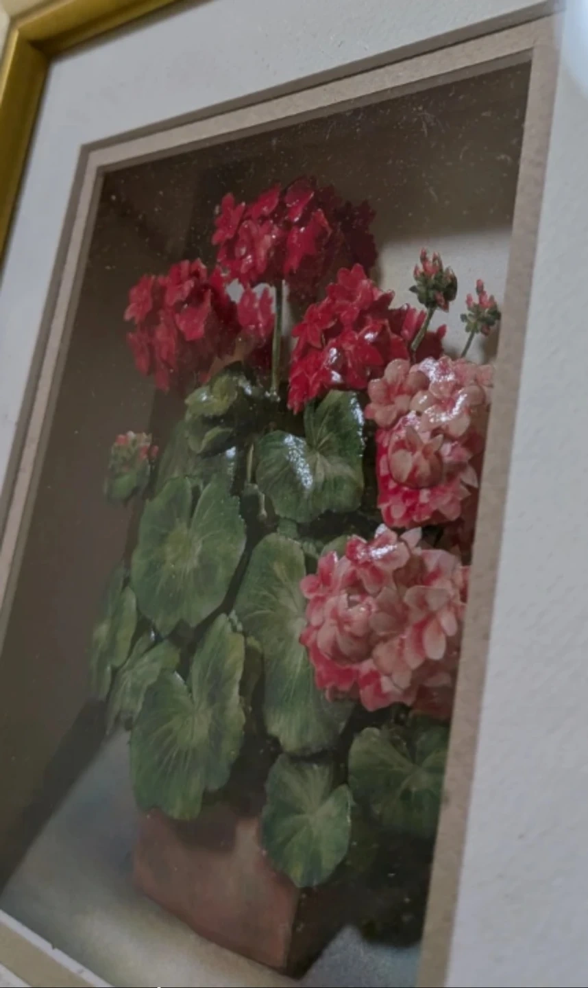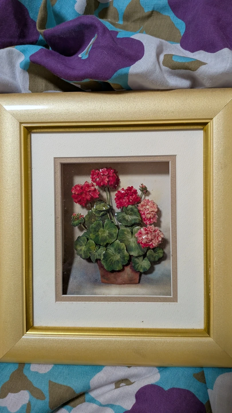 花柄の額縁です。 ・ゼラニウムの3D?何枚か重ねて作られています。 ・フレームの色:ゴールド 中古品であることをご了承ください。