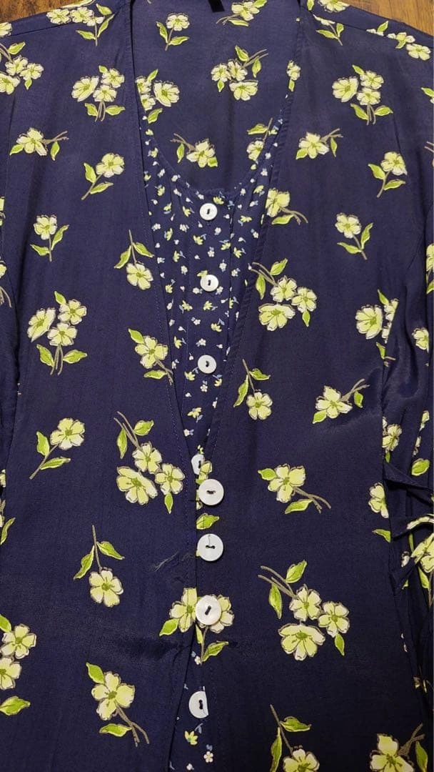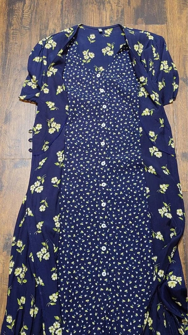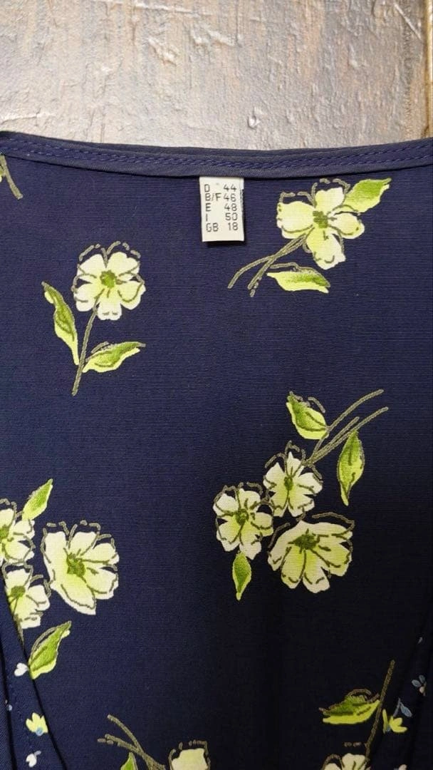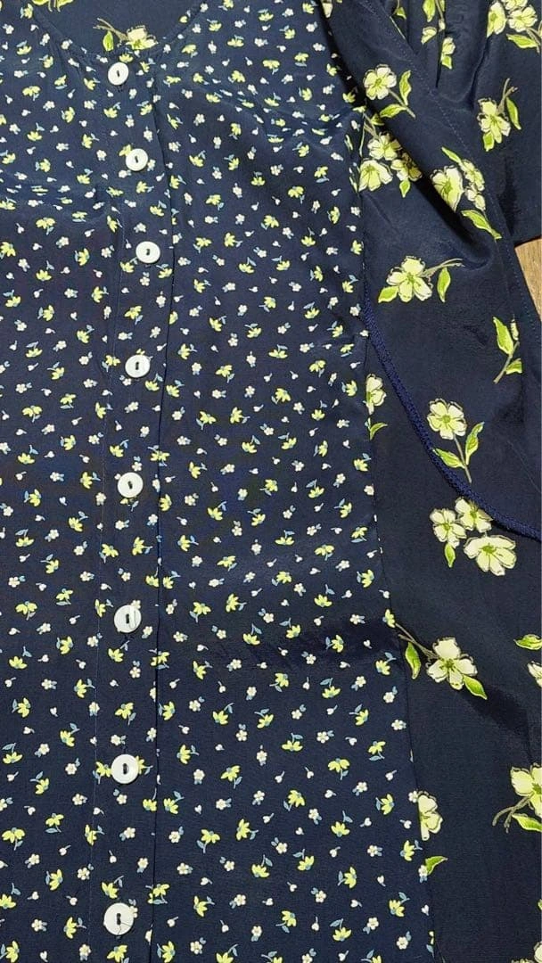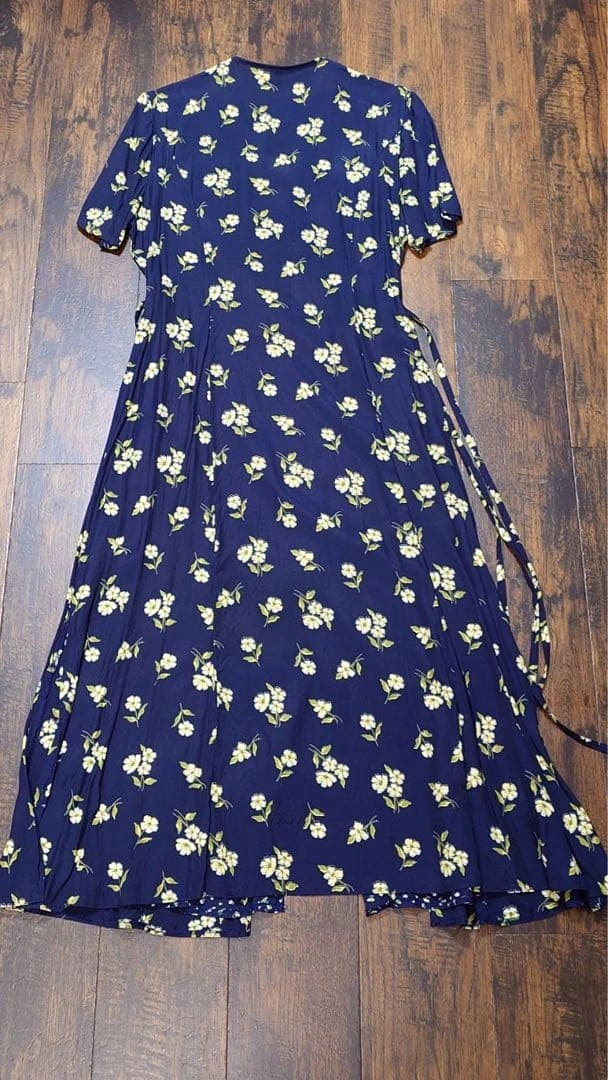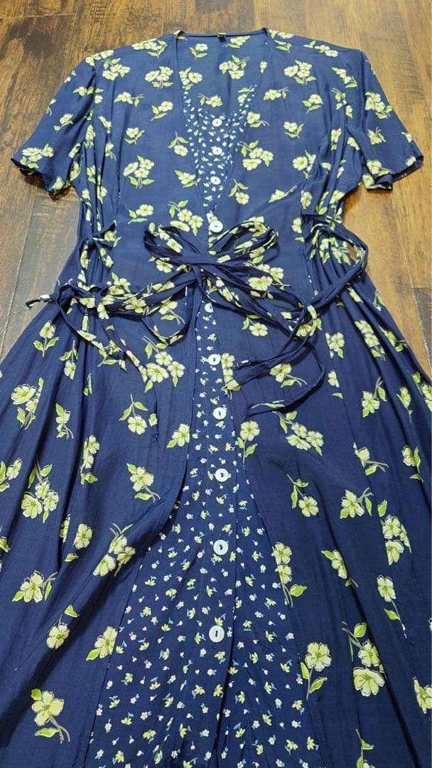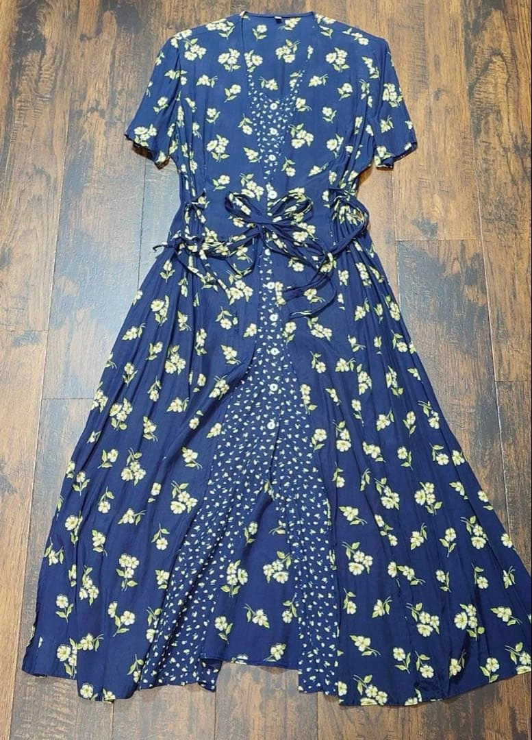 花柄ネイビー切り返しワンピースです。 サイズ表記が海外表記のため詳細がわかりません。Lサイズ相当の者が着てピッタリでした。 凝ったつくりのとてもかわいいワンピースです。リゾートにも、普段にもぜひ! ご希望の方はお気軽にご連絡ください。