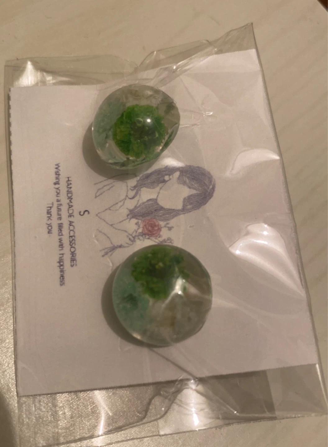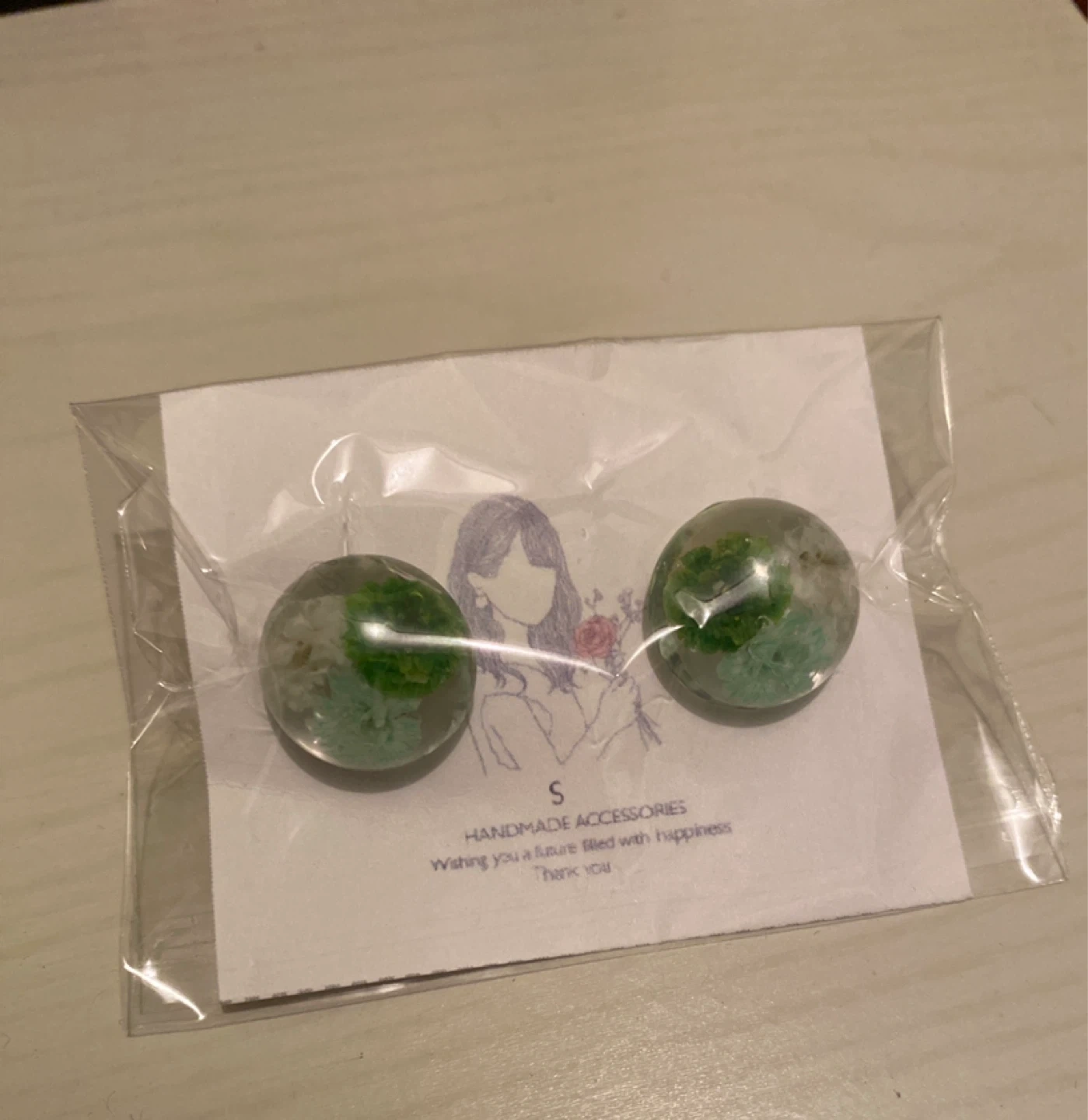 かすみ草のピアスになります。 花のメインの色はグリーンになります。 購入させて頂いたのですが、サイズが合わなかったので。 画像写りが悪く申し訳ありません。 ご連絡下されば、より鮮明な写真を送らせていただきますm(_ _)m