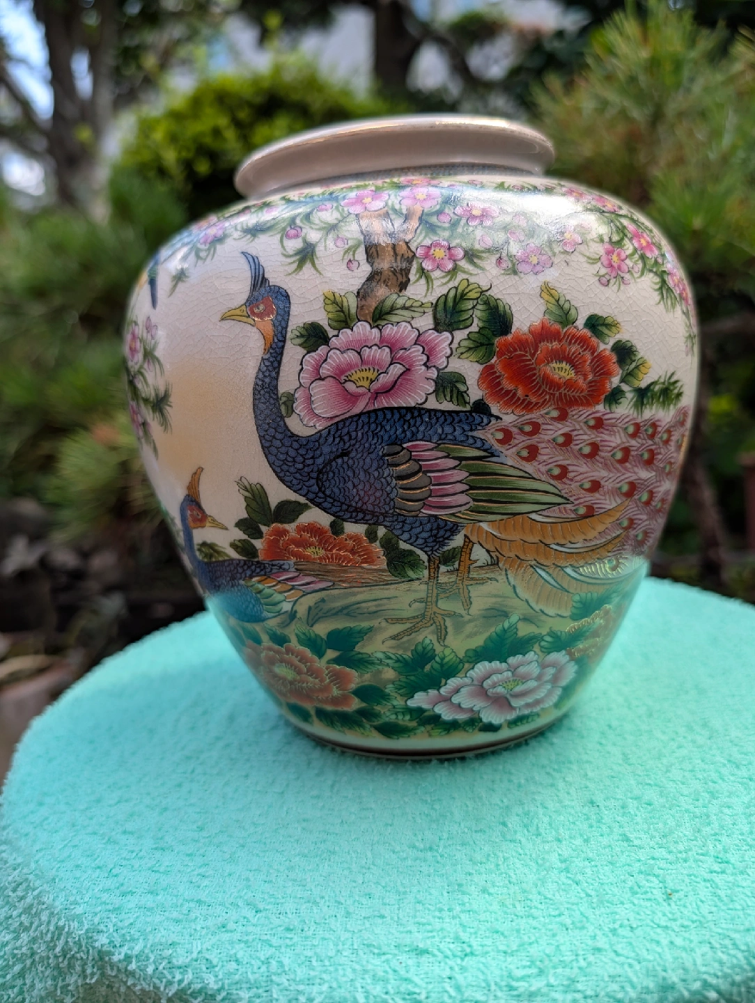 九谷焼の花瓶です。 素人なので詳しく分かりませんが、宜しくお願い致します。 寸法は、幅約18cm×高さ約19cmです。 箱はございません。 ガラスケースの中に入っていた物なので、とても綺麗です。 しかし中古品であることご了承ください。