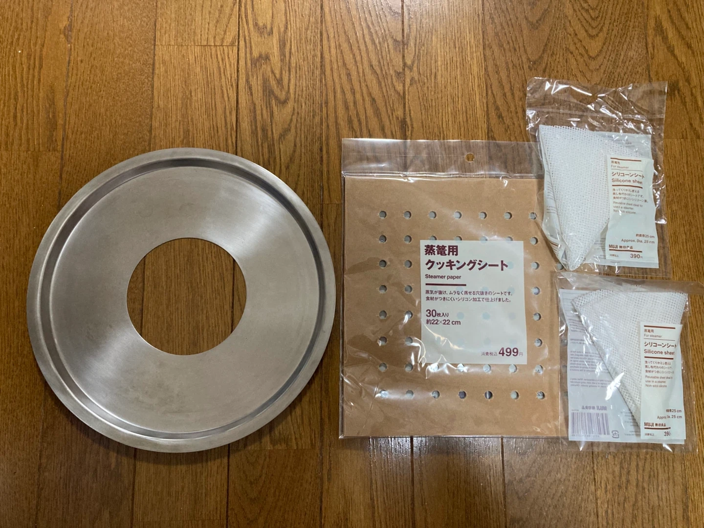 ステンレス製蒸篭受け台(合羽橋のお店で約2700円で購入し3回使用) 無印良品 クッキングシート30枚(未開封) シリコーンシート2枚(1つ開封しましたが結局使用せず。1つは未開封)