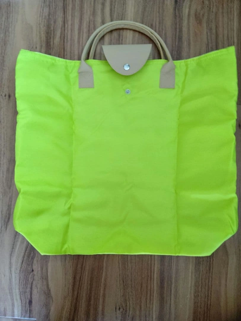 蛍光イエローのナイロン製エコバッグです。折りたたみ可能で、防水加工とファスナーが付いています。 - 色: 蛍光イエロー - 素材: ナイロン - ハンドル: 合成皮革 - 収納方法: 折りたたみ可能 - 付属品: タグ付き JTのノベルティ商品です。 サイズ: 38×31×11 ご希望の方はお気軽にご連絡ください。