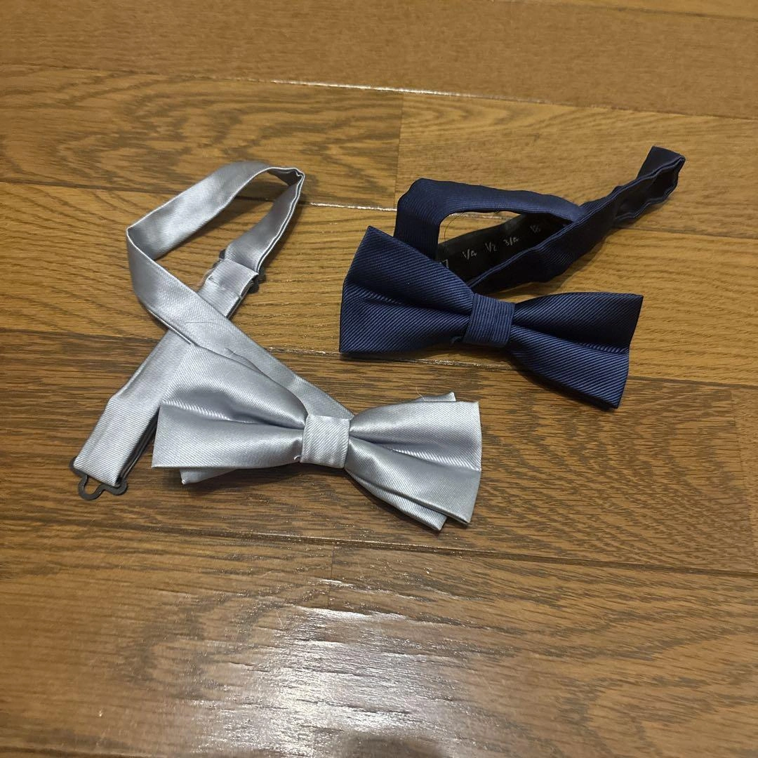ご覧いただきありがとうございます。 シルバーと紺(ネイビー)の配色が上品な蝶ネクタイ2点セットです。 フォーマルなスーツやジャケットはもちろん、ちょっとしたお出かけ用やパーティー、演奏会、コスチュームなど、幅広いシーンで使える便利なアイテムです。 男女兼用(ユニ セックス)で、首元にさっとつけられる簡易タイプ。 状態は良好で、すぐに使える状態です。 海外フォトウェディングに夫が持って行き忘れ、使えていないので新品です。 【セット内容】蝶ネクタイ 2点 【カラー】シルバー × ネイビー(紺) 【サイズ】フリー/首回り調整可能タイプなど 【状態】新品。大きな汚れ・傷なし/すぐ使えます 気になる方、お気軽にコメントどうぞ。
