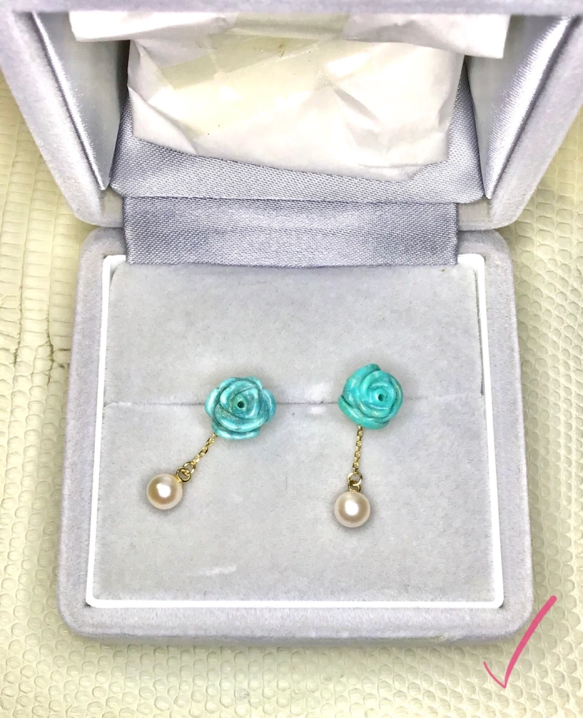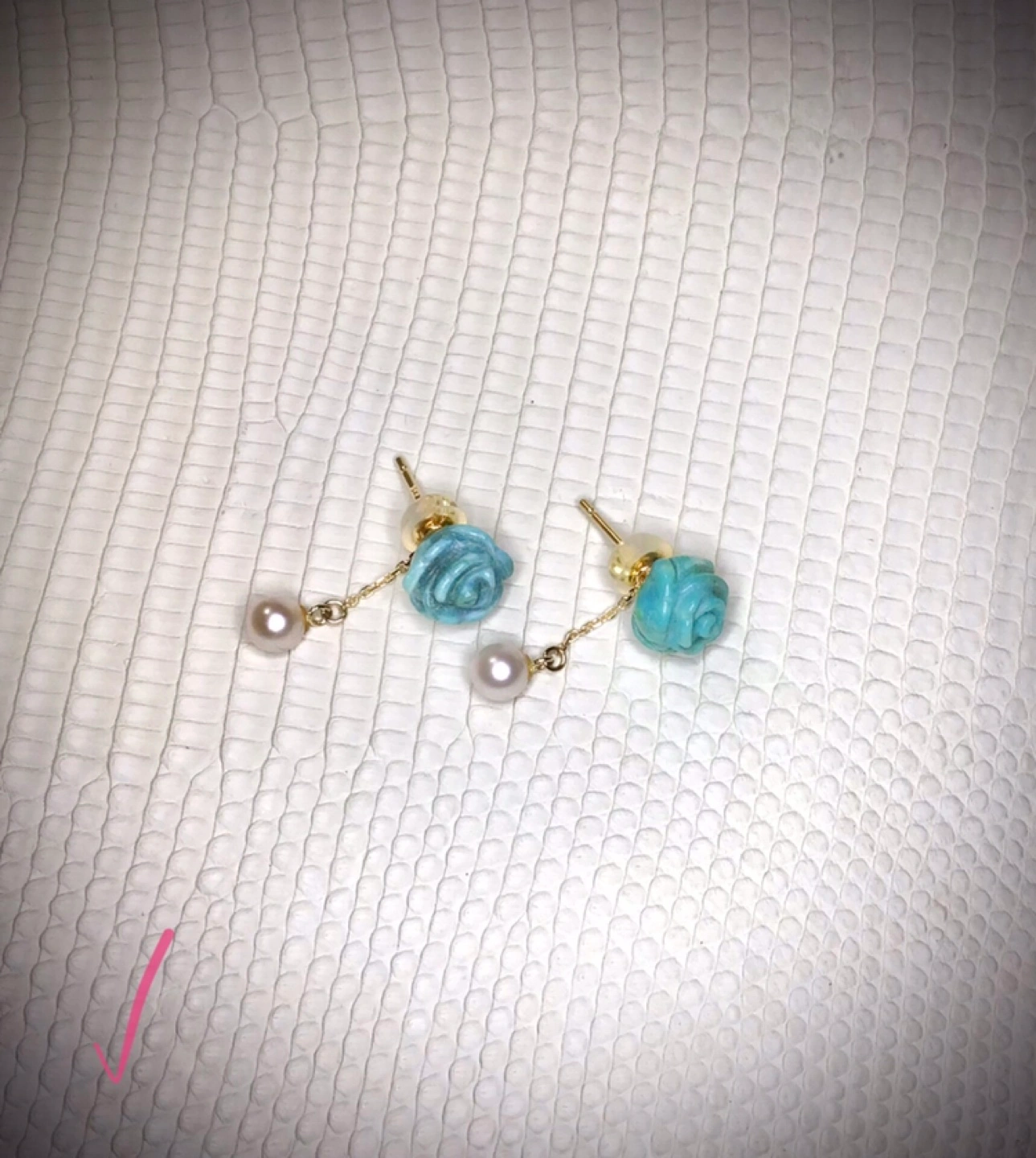 衝撃の美しさ!K18ターコイズピアス2組〜未使用美品 ohsis design 本日お取引き希望です! 想い出詰まったK18ターコイズピアス2組〜未使用美品 ohsis design 元Genuineのカリスマデザイナーだった方に、特別にデザインを相談して製作していただいたオリジナルのピアス2組です。 ◯コンディションは新品美品です。 当初はプレゼント用とし てオリジナル製作していただいた経緯でしたが、プレゼントはされずに自宅保管されていた未使用新品となります。 製作より数年ほど経過しておりますが、保管状態は良く劣化は特に認められません。 ただし、自宅保管につき自然な経年劣化は微細にある可能性はございます。 色味の違う、高品質のターコイズを両方に使用しております。 パーツは全てK18 GOLDです。 フックピアスとキャッチピアスとなります。 キャッチの方は小さな真珠が可愛いアクセントになっております。 どちらも小振りながら存在感はありますし、ラウンドターコイズとフラワーカットターコイズの美しさも抜群に素敵だと思います。 このまま眠らせておくのがあまりに惜しいと思うようになり、思い切って出品致しました。 ターコイズをこよなく愛用し大切に使っていただける方にお譲りししたいです… 当方喫煙いたしません、ペットおりません。 本出品にあたり、高性能なジュエリークリーナーによりクリーニングいたしました。 商品は写真のものが全てです。