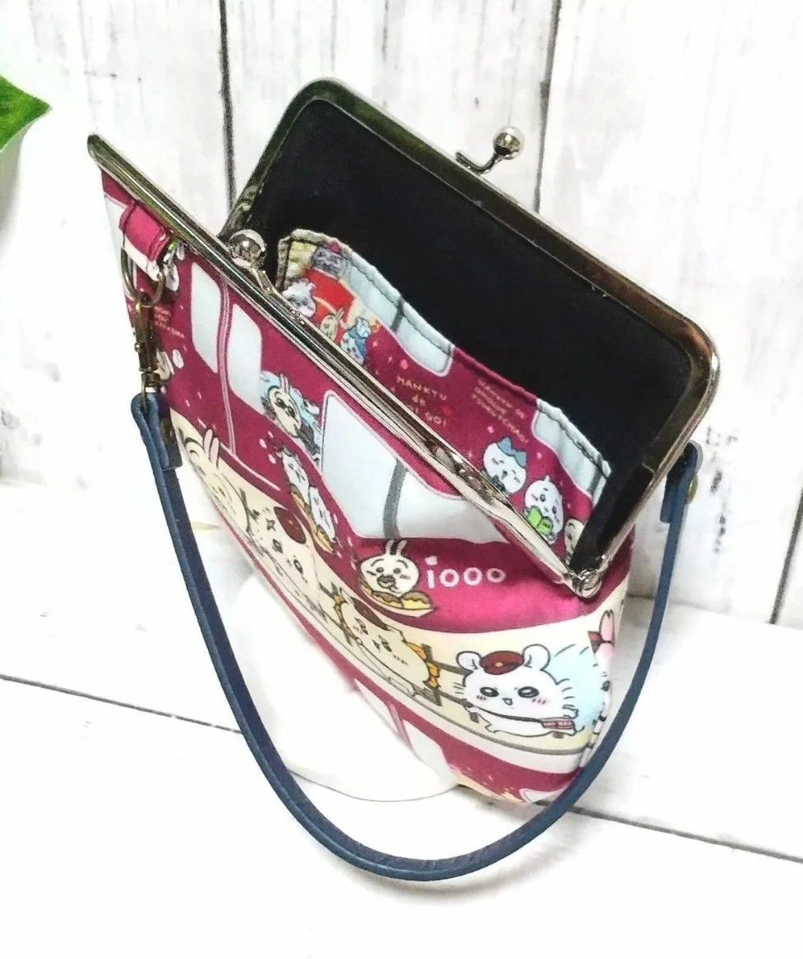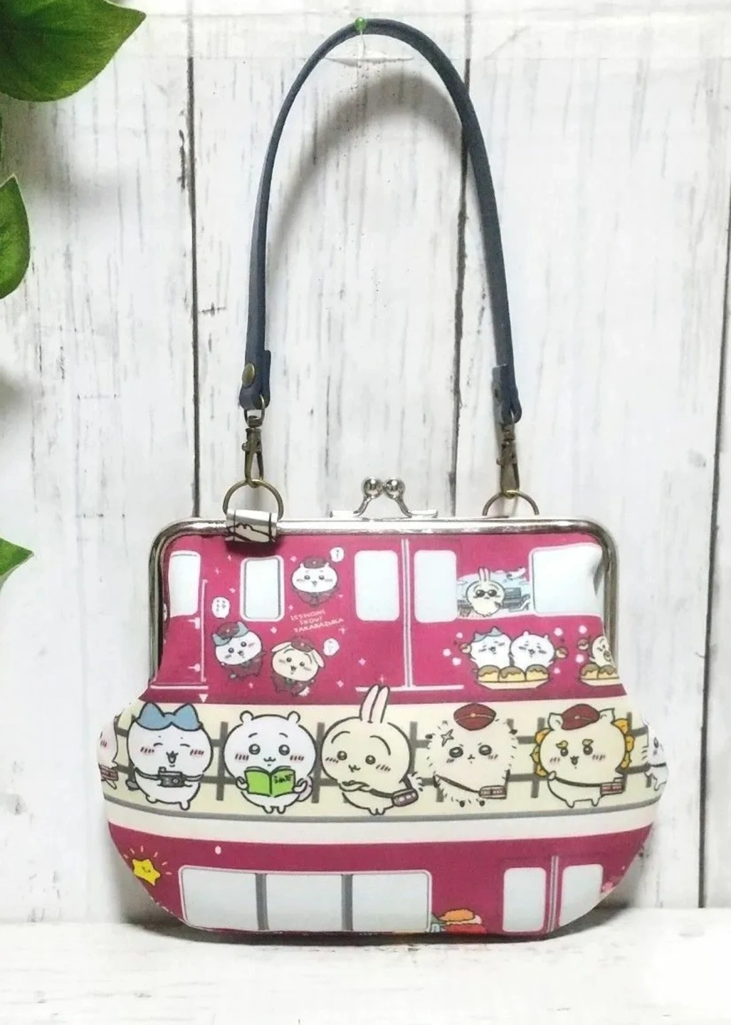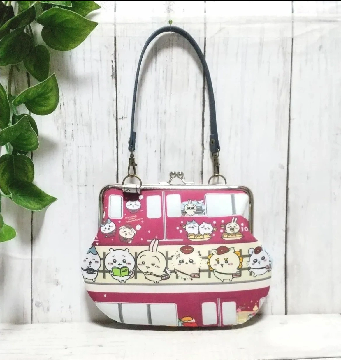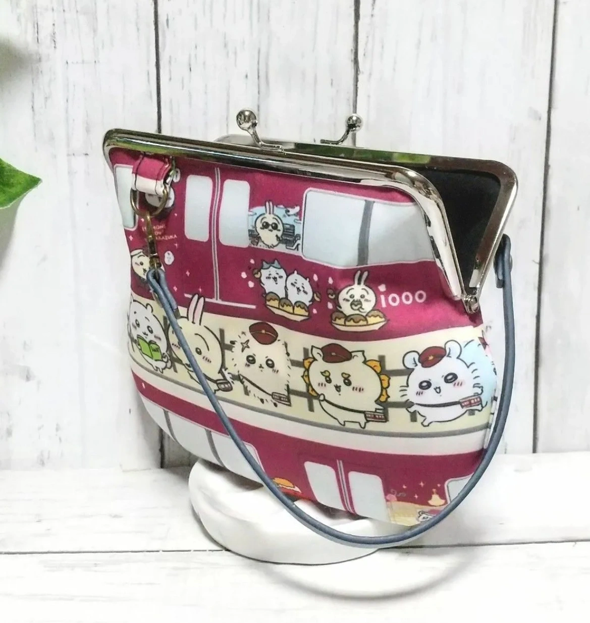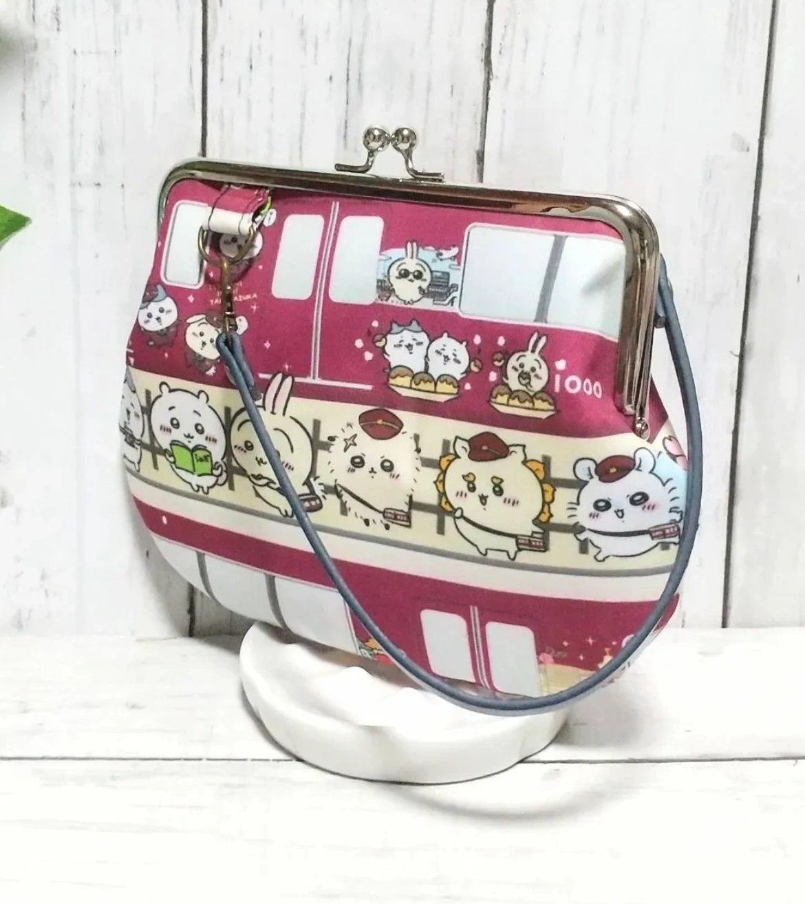 ハンドメイド作家さんより購入しました。 サイズが合わず未使用です。 [商品説明] ちいかわ 電車 角型 がま口ポーチ カン付き コスメポーチ 小物入れ 多目的ポーチ 縦(高さ) 15cm. 横 最大 約 20cm. 1番長い所 口金 16cm. カン付き 持ち手付き です。 サイズは、外寸です。閉じた状態で。 外側のサイズになります。 接着芯やキルト芯を はさんで いますので 内側は外側より少し 小さくなります。 強力ボンドで しっかりと差し込み 作製していますが 差し込みタイプの口金を使用していますので 入れすぎには ご注意下さい。 表地→ハードタイプの接着芯 裏地→接着タイプのキルト芯 を使用しています。 型崩れないよう しっかりタイプに 仕上げました。 内側片面に ポケット コスメポーチ 通帳ケース 小物入れ♪ 多目的にご使用頂けます。 ハンドメイド作品にご理解くださいませ。 ファミリーマート登戸郵便局西店まで来てくださる方、よろしくお願いします