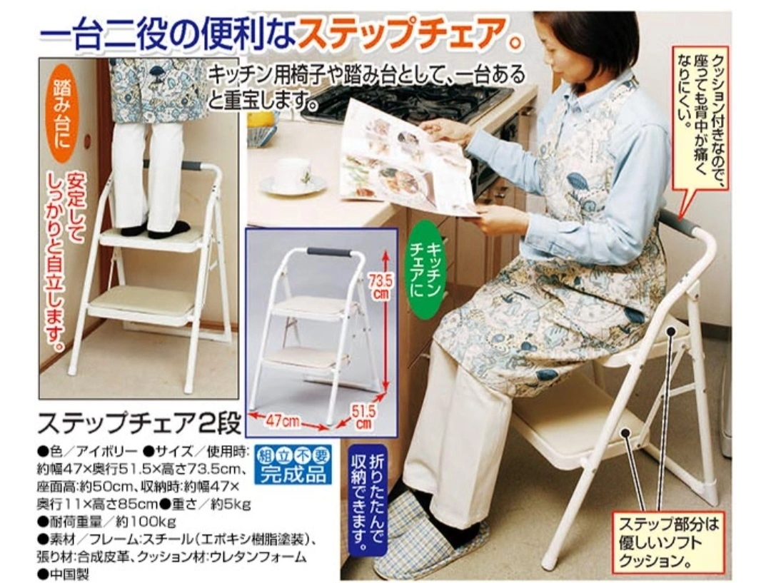 ■引っ越しの準備で家から離れられないなので 24日12時、または 25日13時~15時の間 ~26日まで マンションまで取りに来ていただける方にお願いします 、 四ッ谷三丁目駅と信濃町駅から5分のところです 一台二役の便利なステップチェア。キッチン用椅子や踏み台として、一台あると重宝します。 ●色/アイボリー ●サイズ/使用時:約幅47×奥行51.5×高さ73.5cm、座面高:約50cm、 収納時:約幅47×奥行11×高さ85cm ●重さ/約5kg ●耐荷重量/約100kg ●素材/フレーム:スチール(エポキシ樹脂塗装)、張り材:合成皮革、クッション材:ウレタンフォーム 使用感あります、
