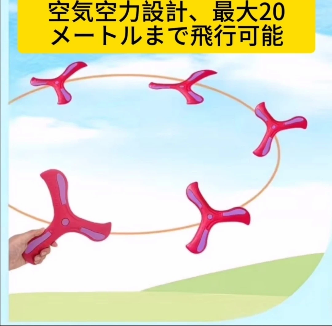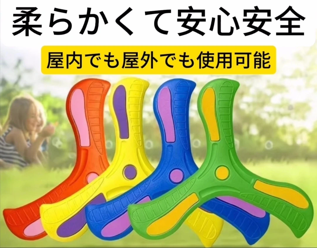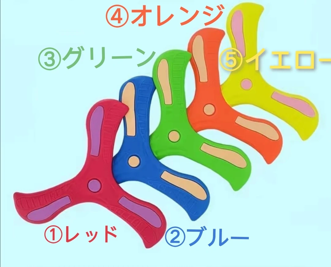 商品特徴: スロー&キャッチに挑戦!子供から大人まで手軽に遊べる、柔らかで安全なEVAフォーム製のソフトブーメランです。 軽くて投げやすい3枚翼型で、上達すれば投げた後に回転しながら直径約20m前後の弧を描いて手元に戻ってきます。 スローイング動作による手首や腕の強化や、ブーメランを目で追う事で動体視力を養う屋外スポーツとしても楽しめます。 ・カラー:5色選べる ①レッド ②ブルー ③グリーン ④オレンジ ⑤イエロー ・材質:EVAフォーム ・サイズ:20×20cm、半径約12cm ・重量:約13g ・対象年齢:6歳以上 ・セット内容:ソフトブーメラン1個 ・上達こつ:両指で下部をつまんで、まっすぐ真上(正面上方)に垂直に投げ出す。