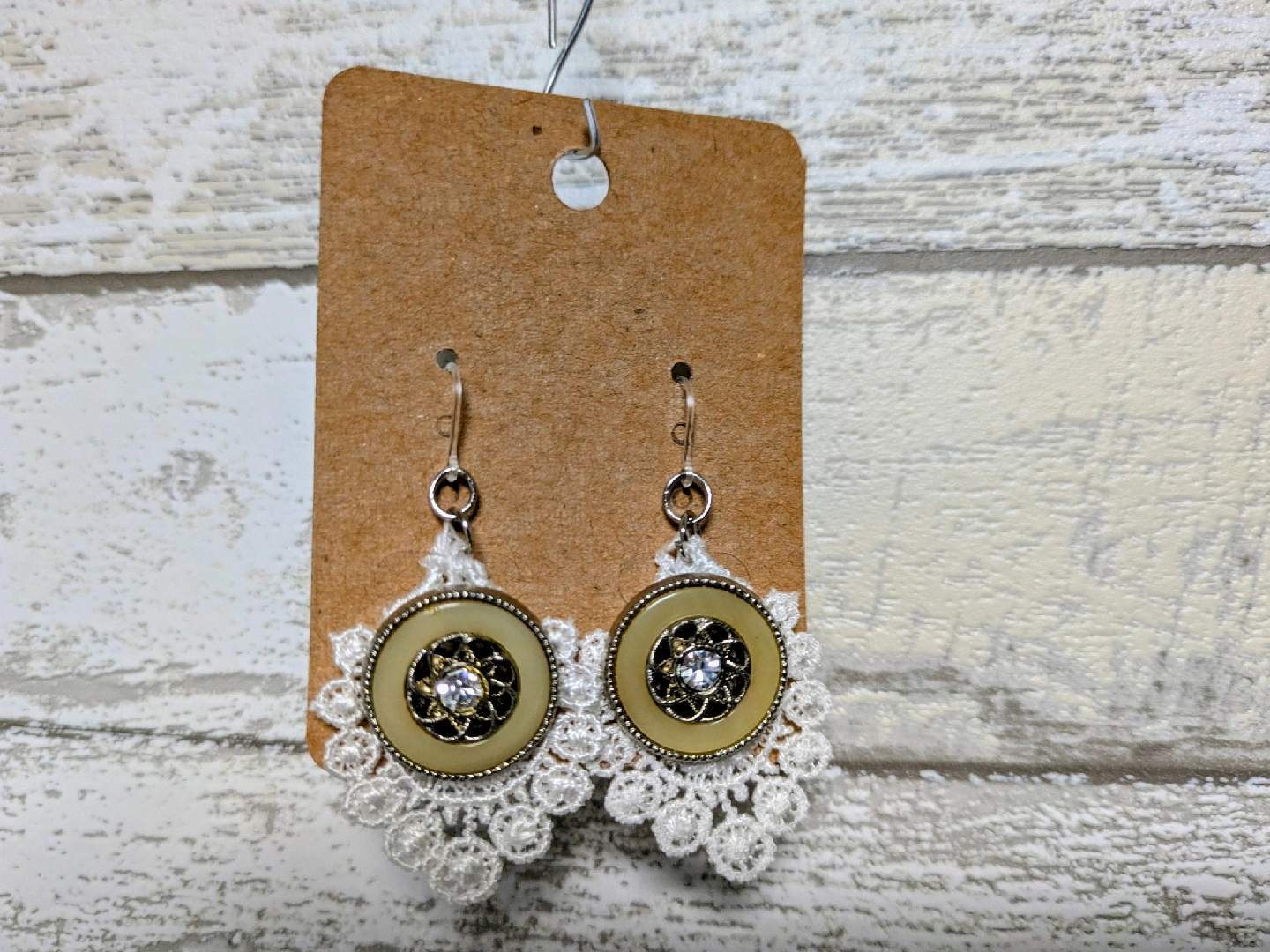 ハンドメイドのピアスです。 金属アレルギーの方も使えるシリコン製のパーツを使用しています。 ベージュのレトロボタンと、白いレースの組み合わせです。 レース部分の長さは、約3.5cmです。 ☆軽いイヤリング(ノンホールピアス)に変更可能です。
