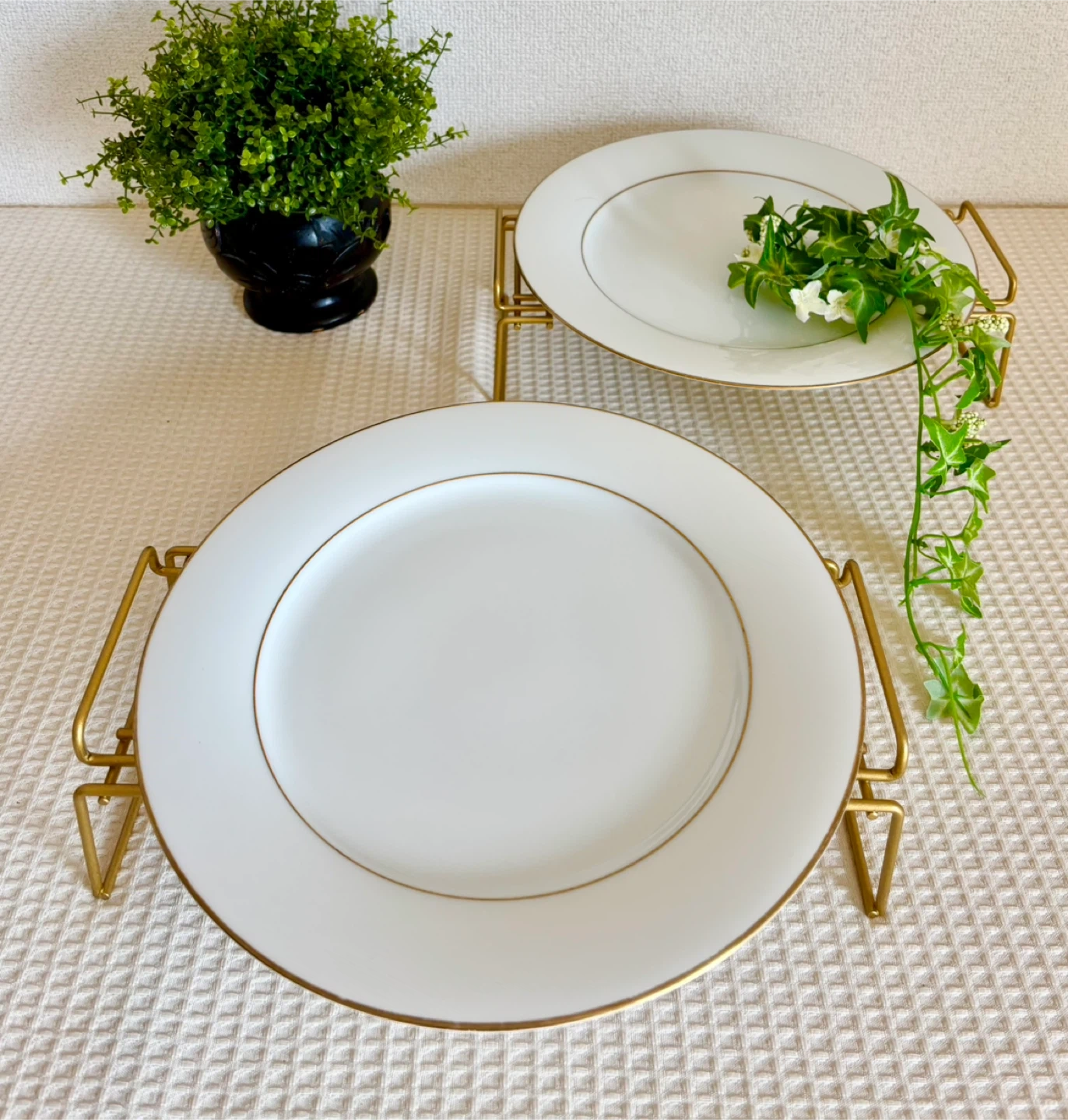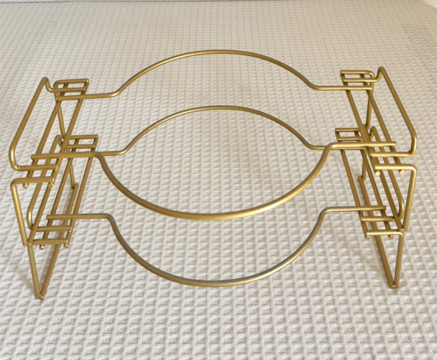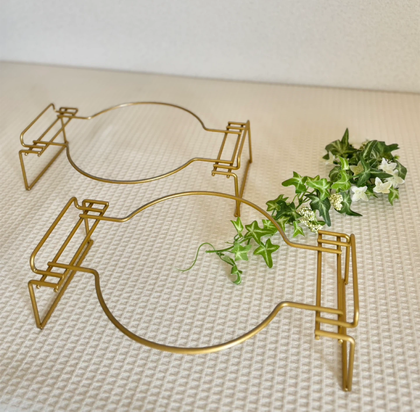 金色の金属製プレートホルダー、 スタイリッシュなデザインで食卓を飾ります。 スタンドにのせるとゴージャスな雰囲気になるのではないかと思います、 お皿を乗せた写真は見本です、お皿と造花は付属しません。 ★ちなみに見本のお皿の直径は約26.5センチ位 ★ホルダーの大きさ 高さ  約8.5センチ位 横幅  約29センチ位 自宅保管品、中古品です。ご理解ある方にお譲りします。 - Material: Metal - Color: くすんだゴールド - Design: Plate holder - Type: Stand ご覧いただきありがとうございます。 #プレートホルダー #ゴールド #パーティー #クリスマスパーティー #ハロウィンパーティー #ディスプレイ #料理