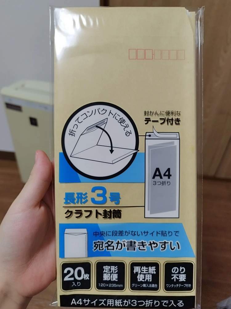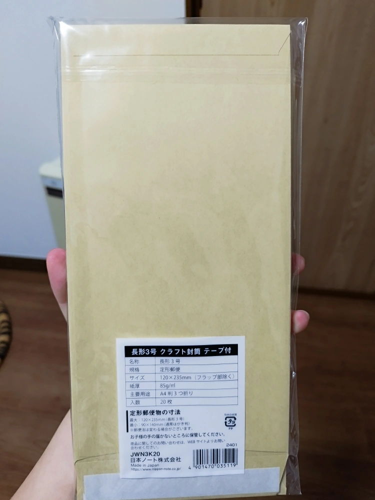 ・長形3号 ・クラフト封筒 ・テープ付き ・A4用紙3つ折りで入る ・20枚入り ・サイズ:120×235mm サイズを間違えて購入してしまいました💦