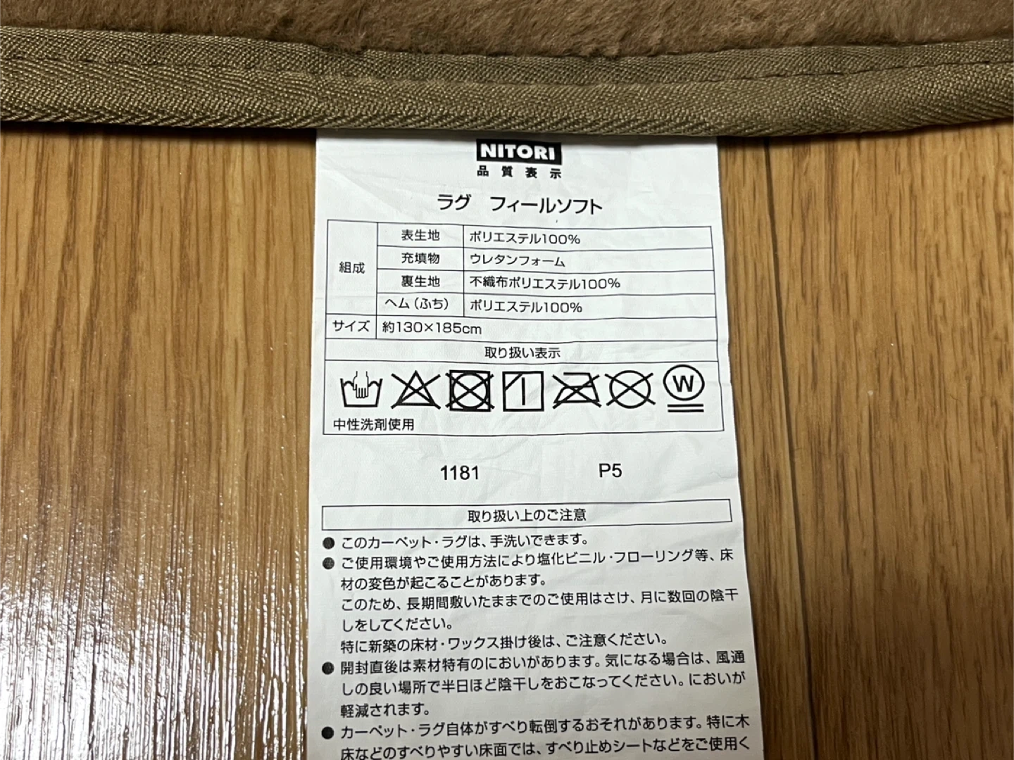 【美品・未使用品に近い】 ニトリ 洗える ふわふわやわらかラグ フィールソフト BR ブラウン ラグ カーペット 絨毯 1m30cm × 1m85cm 限定品 人気商品 ニトリの洗える人気のラグ「フィールソフト」ブラウンカラー、未使用品に近い美品です。 ●床暖房・ホットカーペット対応 ●抗菌防臭加工・クッション性アップ! ●手洗いOK 購入後は2週間ほど使用し畳んで袋にいれたまま自宅暗所にて保管しておりました。 シンプルでお部屋に馴染みやすいラグですが、 他にラグを購入したため、ご活用頂ける方にお譲りできればと思います! ーーーーーー 受け渡し日時/場所: 引越しのため2025年12/1(月)〜12/7(日)の間で 小田急線の祖師ヶ谷大蔵駅付近希望です! 改札を挟んでのお取引きも可能です。 お気軽にご相談ください。 種類:ラグ カーペット カラー:BR ブラウン サイズ:約130×185cm 素材:ポリエステル100% 定価:2,960円 状態:美品・未使用品に近い ※状態は添付写真をご参照ください。 未使用に近い美品ですが中古品+自宅保管のため、ご理解いただける方にお譲りできればと思います。お渡しの際は簡易的な梱包材で包んでお渡しさせていただきます。 他にも色々出品しております。 まとめてのお取引きも大歓迎です! 他サイトでも出品しているため、気になる方お早めのご連絡をお待ちしております! ーーーーーー ▼検索ワード ニトリ 洗える ふわふわ やわらか ラグ フィールソフト BR ブラウン ラグ カーペット 絨毯 限定品 人気商品