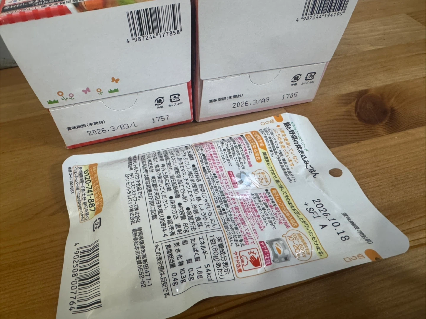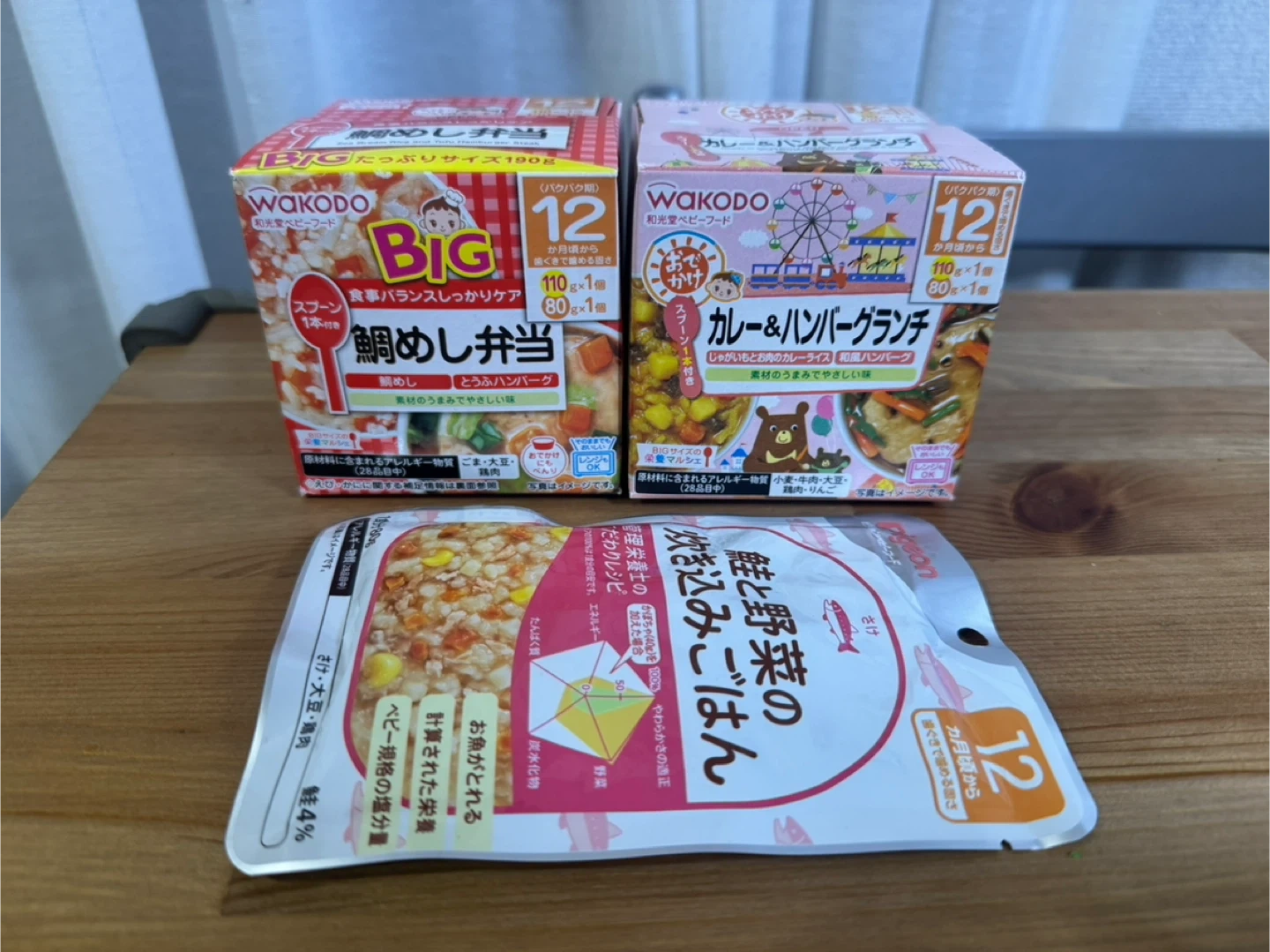和光堂の鯛めし弁当、カレー&ハンバーグランチのビッグサイズのベビーフードと、ピジョンの鮭と野菜の炊き込みご飯のパウチです。 いずれも12ヶ月頃〜の記載があります。 賞味期限は箱が二つとも2026.3月、パウチが2026.10月です。 下の子がこのタイプのベビーフードを食べなくなってしまったのでどなたか必要な方いましたら。