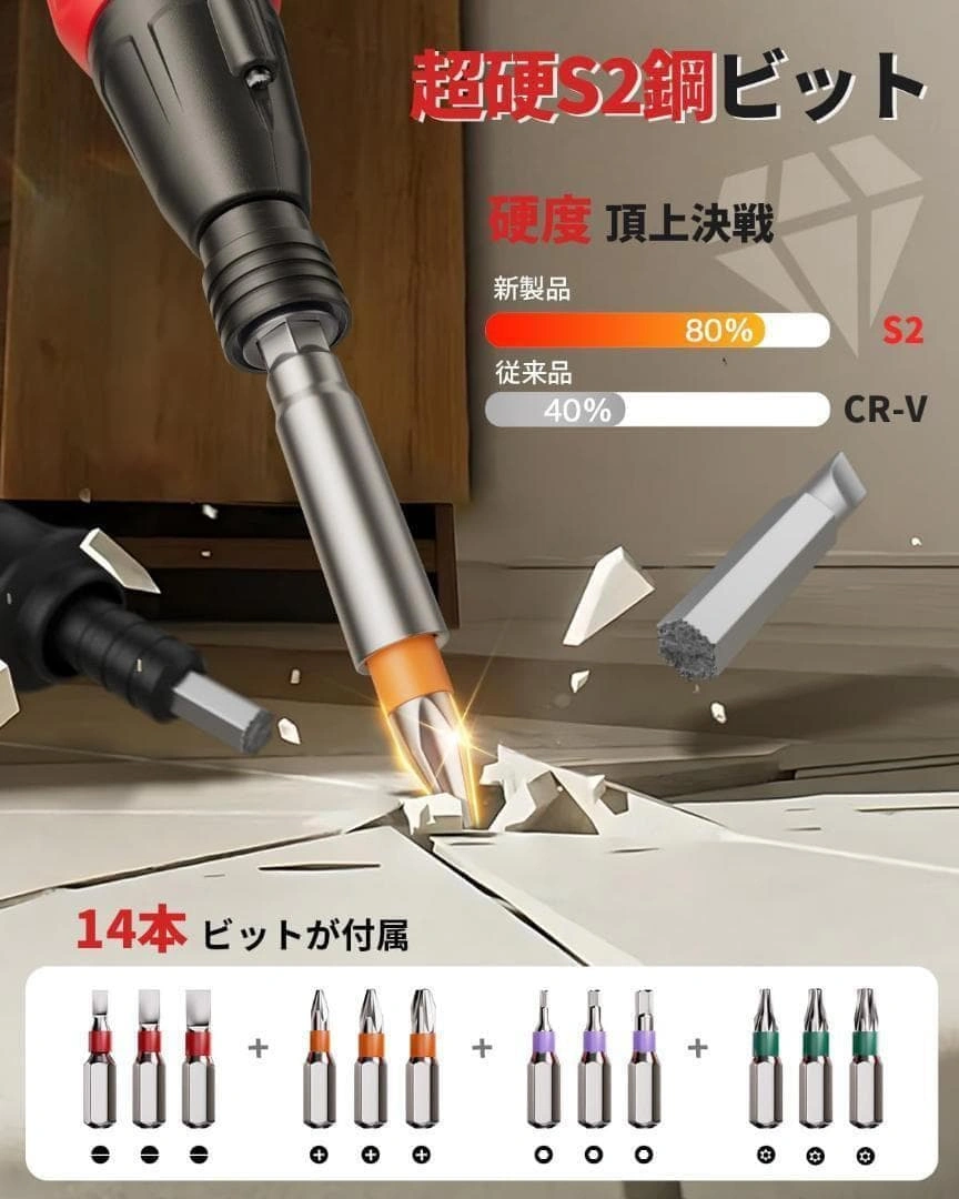 未使用品です(検品のため開封済み)。 【2025年業界新基準・最新強化版電動/手動両用ドライバー】 全銅モーター採用で強力な駆動力と高い耐久性を実現。片手で簡単に正逆切り替え可能、電動モード最大トルク3N・m、手動モードでは10N・mを発揮。プロユースから家庭用まで幅広く対応。滑りにくいボール型グリップ設計で作業が安定し、わずか158gの軽量ボディで長時間使用も疲れにくく、取り付け・取り外しが省力化。女性や高齢者でも簡単に操作できます。 【超安定スクエアグリップ設計・TPE強化素材採用】 CPWORLDドライバーのグリップは、他社製品の丸型デザインと異なり、人間工学に基づいたスクエア形状を採用。手のひらに99%フィットする設計で、より楽に握持できます。どの方向から握っても最適な使い心地を実現。さらに新開発の高分子素材「熱可塑性エラストマー(TPE)」で二倍以上の安全性を強化しました。 【高品質合金ビット・フルセットS2工業規格】 本ドライバーのビットセットは、S2工業規格に準拠した高硬度・高強度合金を採用。破損リスクを排除しました。14本の交換用ビット付属でSL4/SL5/SL6/PH1/PH2/PH3/H3/H4/H5/T15/T20/T25など多様なネジに対応。家庭内のあらゆる作業ニーズをカバーします。ビットホルダーには磁気吸着機能を内蔵し、精密な位置決めと落下防止を実現。 【磁力式ビットチェンジシステムを採用】 スライド式マグネット機構でワンタッチ装着 作業中のビット脱落を防止 女性や高齢者でも確実に交換可能。 【高輝度LED照明・1800mAh大容量バッテリー】 CPWORLD電動ドライバーは洗練されたデザインを保ちつつ、作業部を明るく照らす高輝度LEDライトを装備。スイッチを押すだけで即時点灯し、夜間や暗所での作業もストレスフリー。Micro USB充電式採用で電池交換不要、1800mAhの大容量バッテリーにより最大70分間の連続使用が可能で作業効率を大幅向上。充電時は5V1Aの充電器をご使用ください。 ご希望の方はお気軽にご連絡ください。