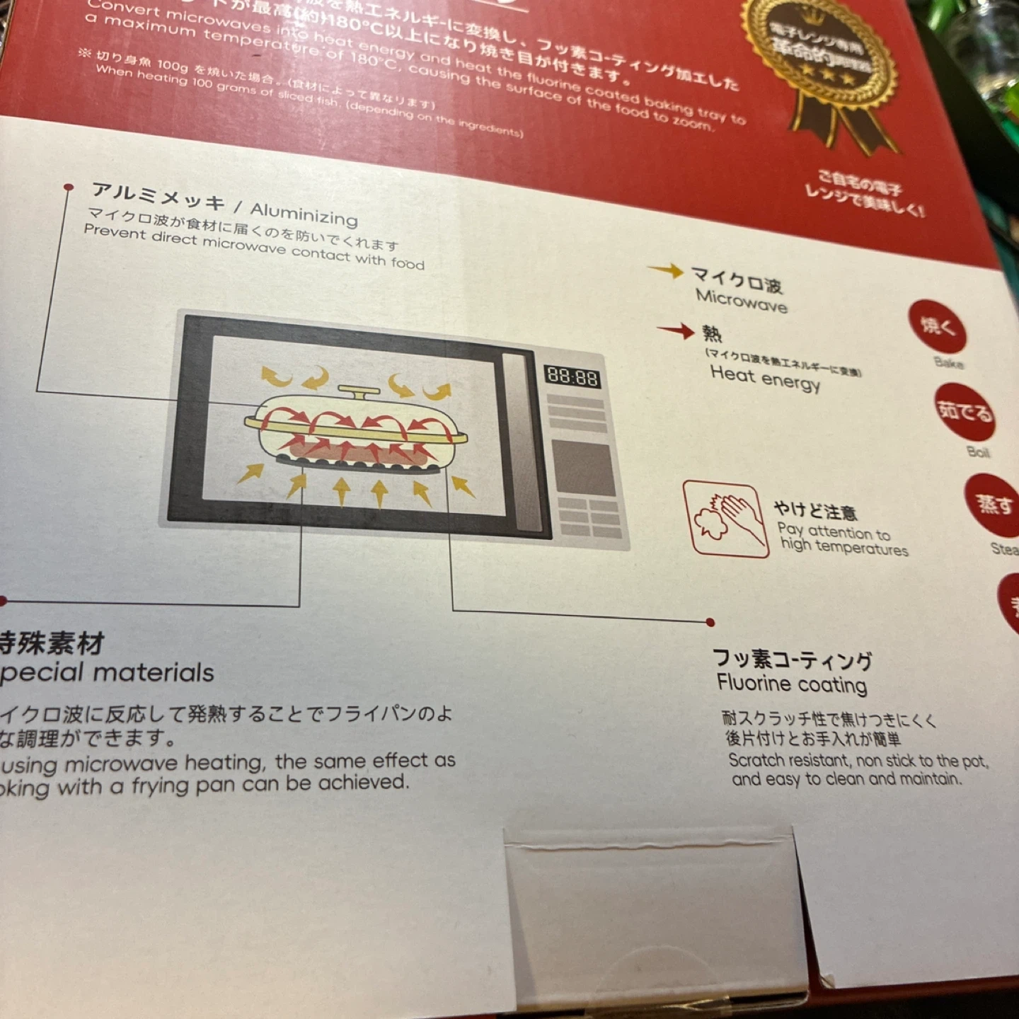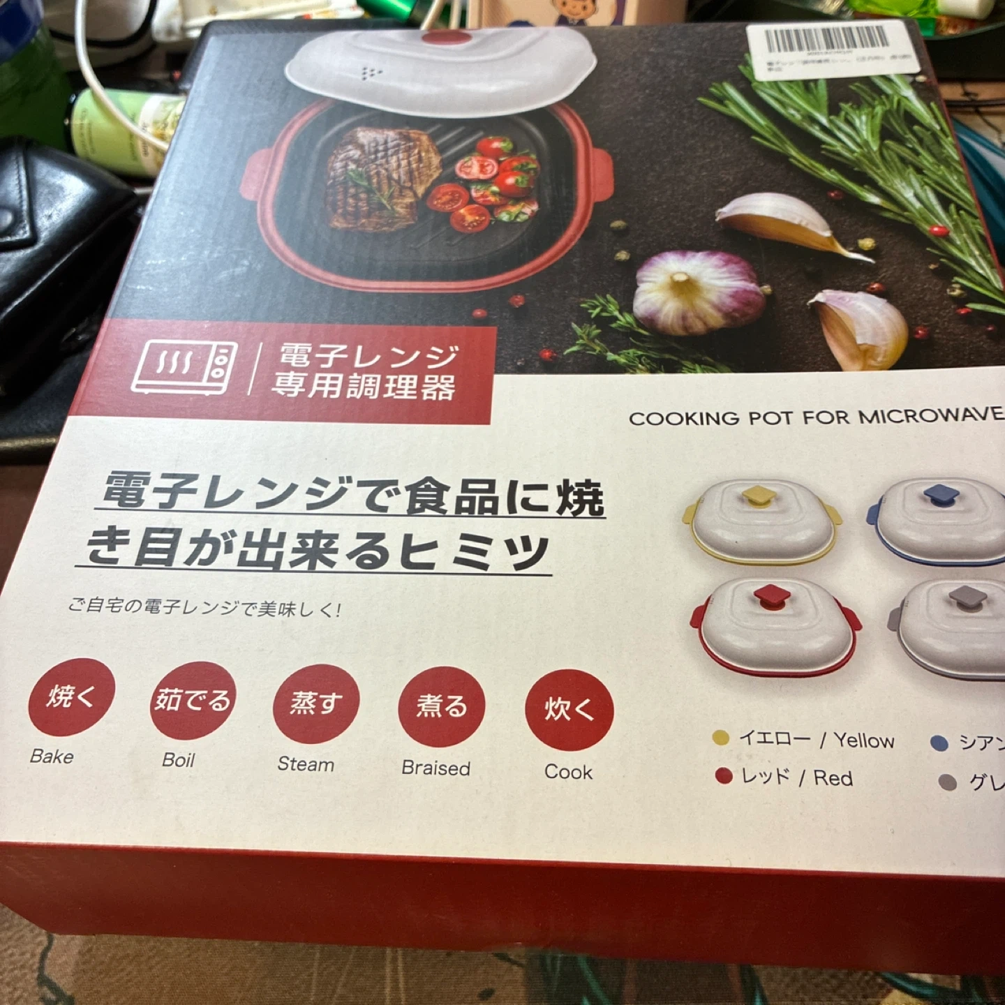 電子レンジ専用調理器です。 ・電子レンジで食品に焼き目が出来るヒミツ ・サイズ(外):268×232×90mm ・サイズ(内):200×200×30mm ・容量:約900ml ・素材:アルミニウムメッキ鋼材、PTFEコーティング、シリコン ・焼く、茹でる、蒸す、煮る、炊く調理が可能 中古品であることをご了承ください。