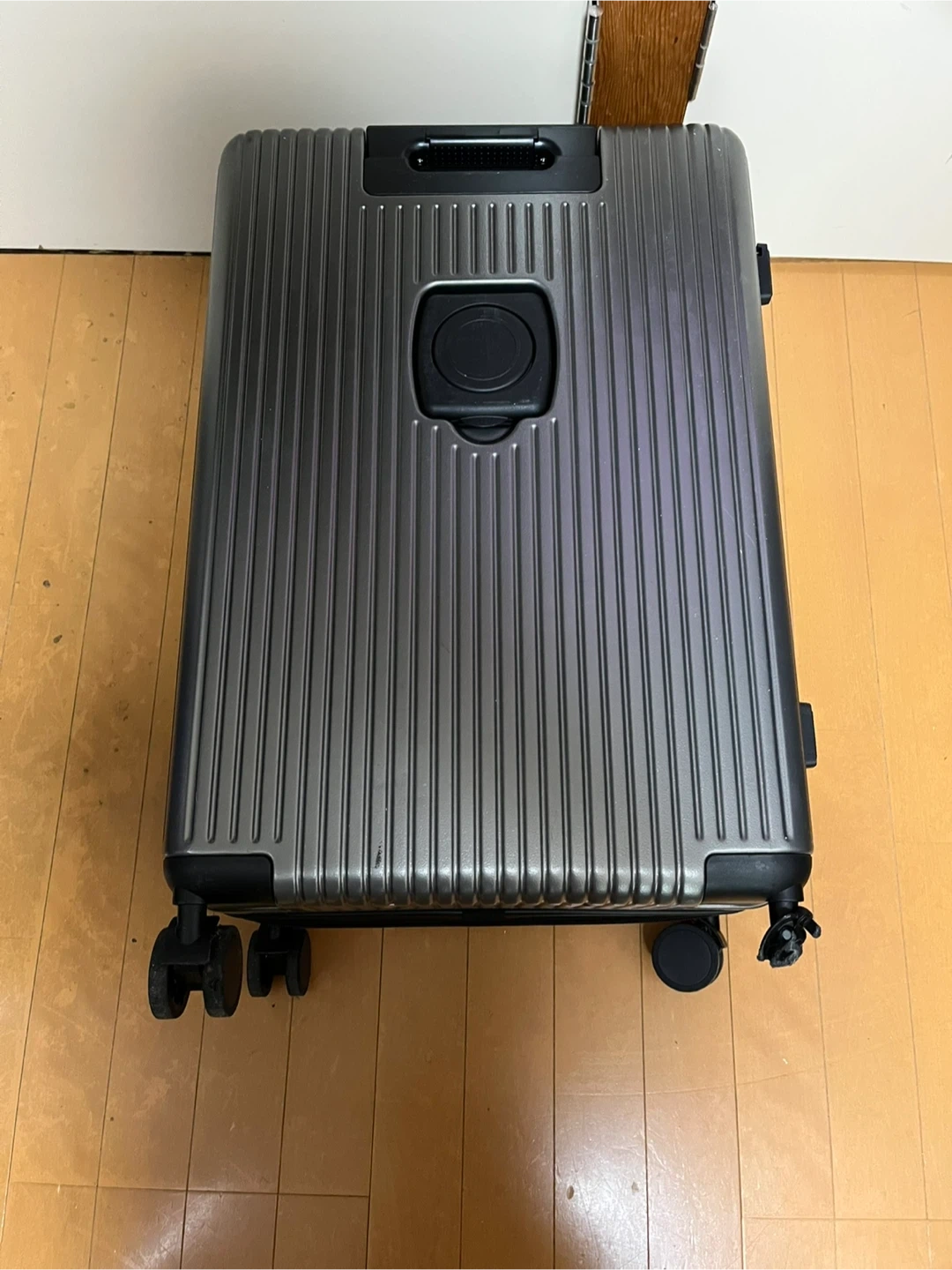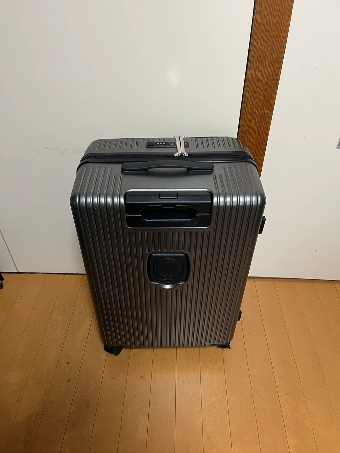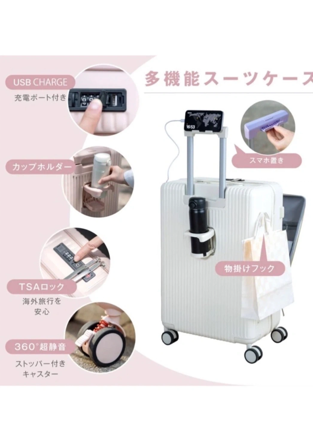 多機能スーツケース M グレー ・サイズ:M(W44×D29×H65cm) ・容量:67L ・重量:約4.5kg ・4〜7泊 【情報】 種類:スーツケース 特徴:USB充電ポート付き、カップホルダー、スマホ置き、TSAロック、360度キャスター 使用回数:1回のみ 一つのキャスターは壊れてしまい、ミスターミニットで修理不可になりまして、ご了承下さい。