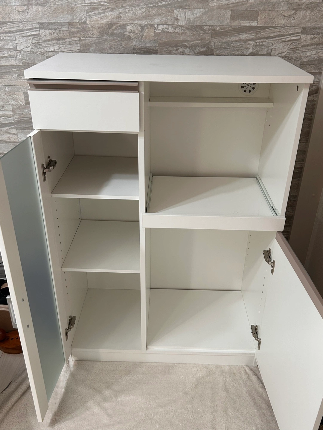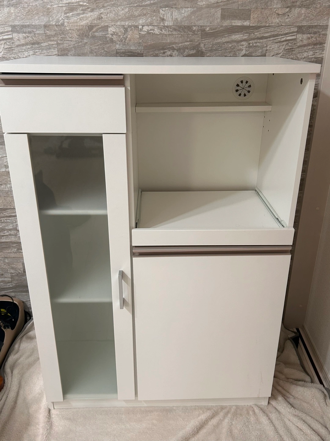 ・カラー:白 ・中古品 ・棚付き ニトリで数年前に購入しました。 大切に使っていた為、綺麗ですが向かって左側にフックを取り付けていますが、全体的にはとても綺麗です。 取り外すと塗装が剥がれそうなので、そのままにしてあります。 ホームクリーニングで綺麗にした為、直ぐにお使い頂けます! 自宅まで取りに来て頂ける方。 あくまでも中古品の為、ご理解いただけます方。 よろしければ是非✨ご検討ください。