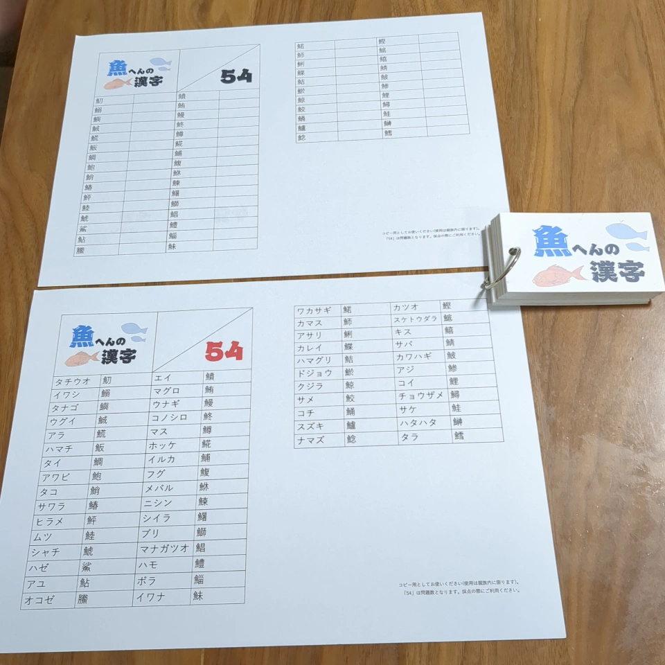 54種の魚へんの漢字を覚える事が出来ます。 プリントはコピーして使えば何回も書き取りテストが出来ます。 JR中野駅、高円寺駅、阿佐ヶ谷駅のいずれかで平日の夕方4時半頃に手渡し可能な方、もしくは中野区上鷺宮の自宅まで取りに来て下さる方でお願いします。 自宅まで取り来られる方には少しですがお値引き致します。