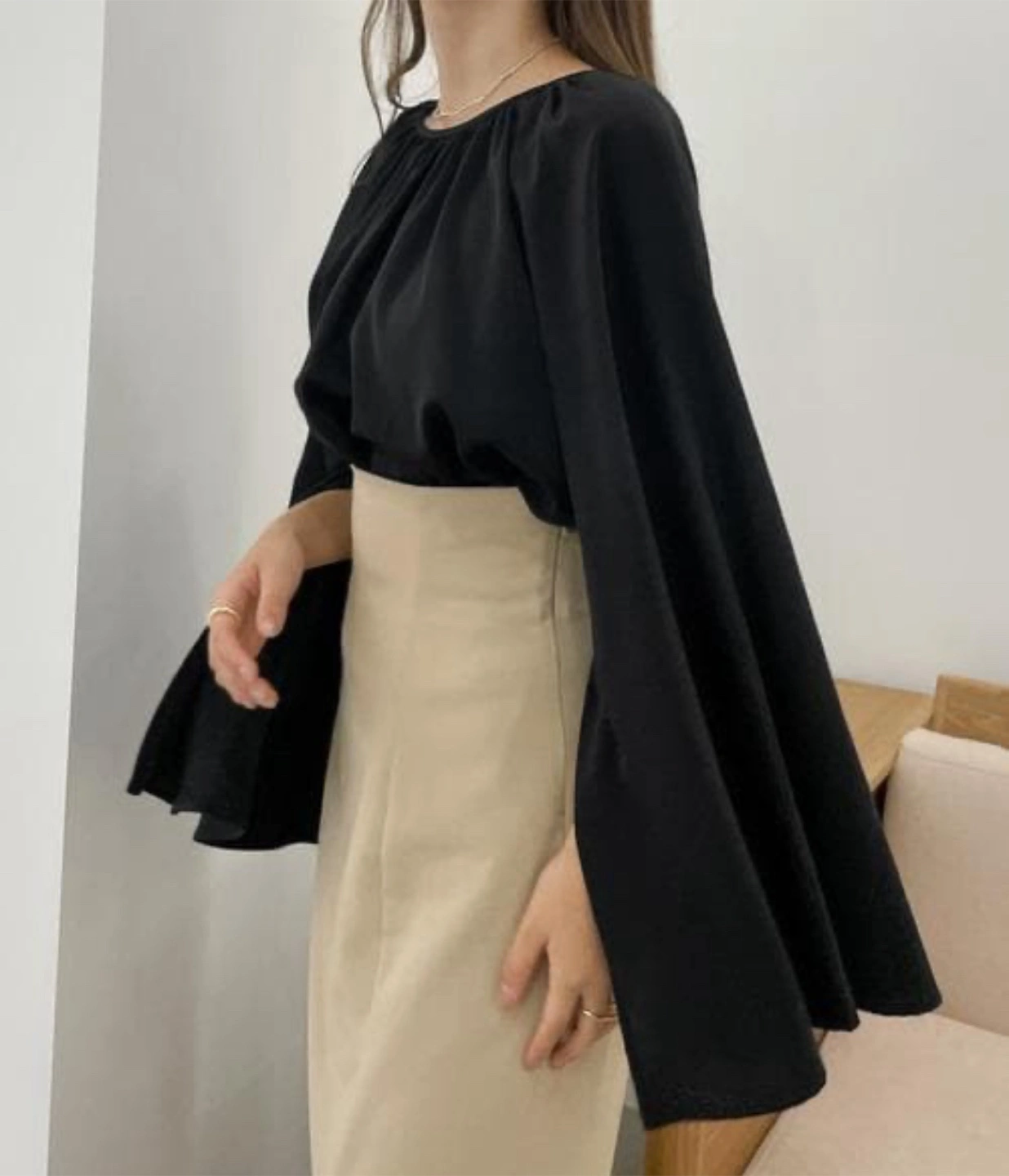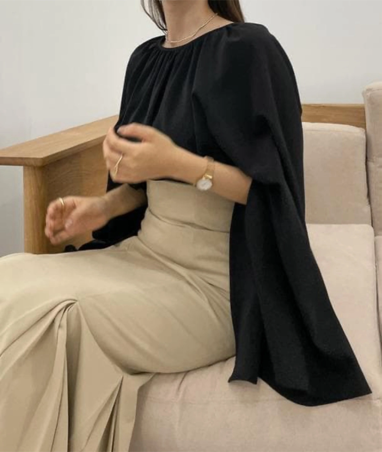 黒トップス ベージュスカート セットアップ