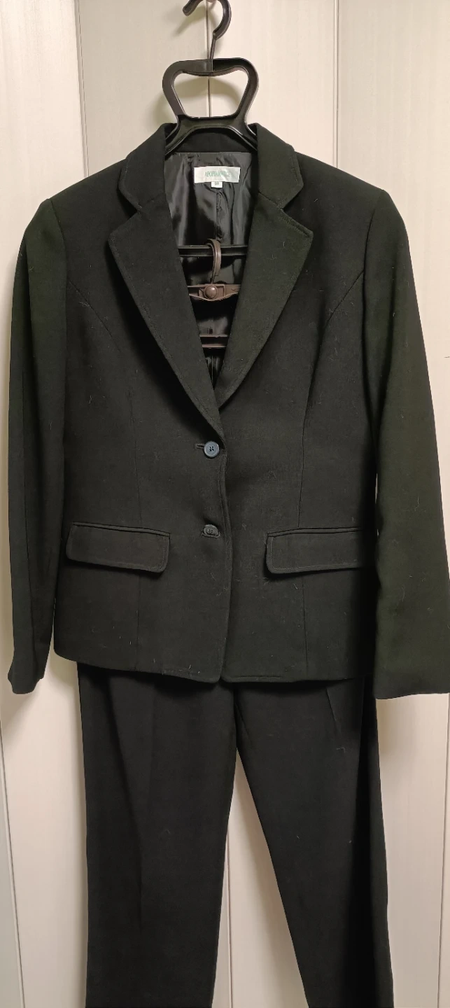 黒のパンツスーツです。 上着には裏が付いていますが、パンツには裏が付いていません。 喪服として2回着用し、その後自宅保管しておりました。 ・ブランド:アポピアマッチ ・サイズ:9R ・カラー:ブラック ・素材:ポリエステル100% ・状態:目立った傷や汚れなし