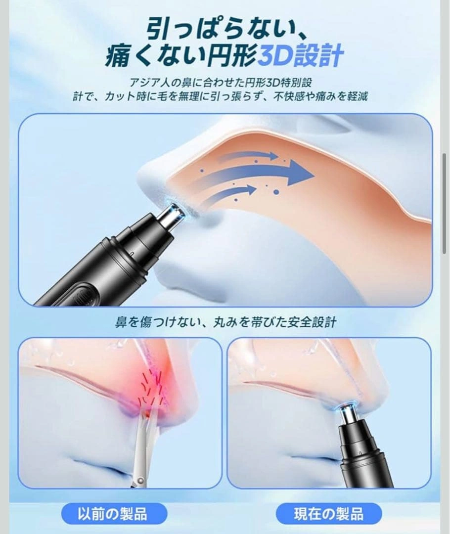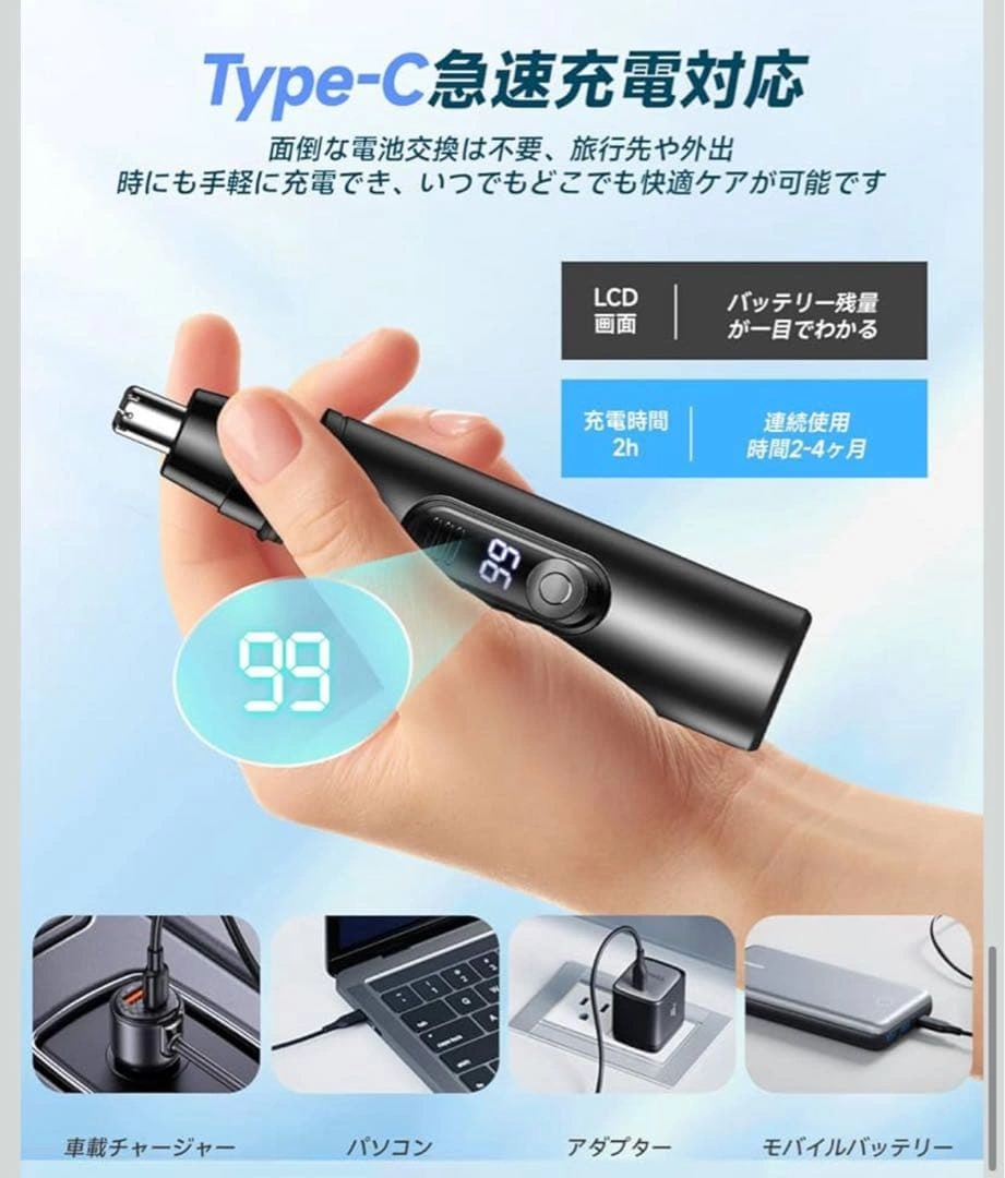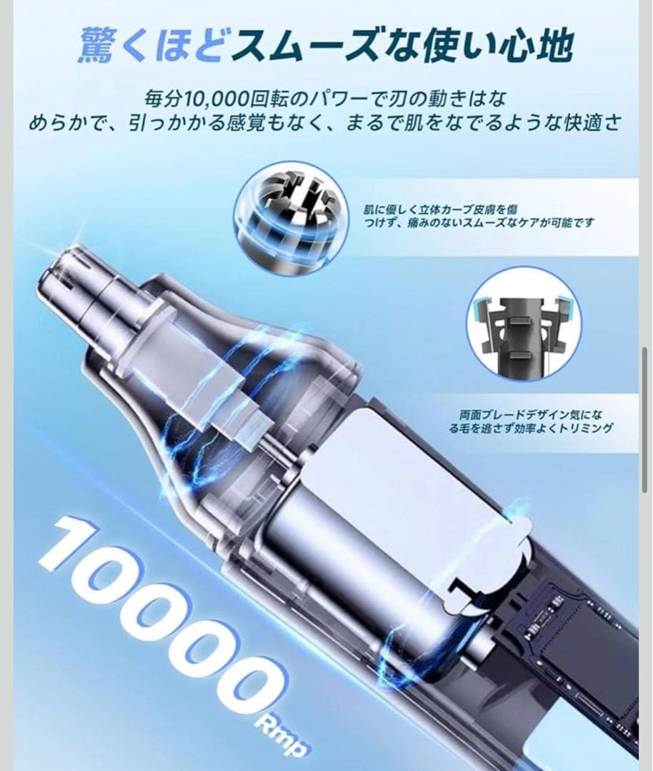 数ある中からご覧頂きありがとうございます(^○^) 【パワフルな回転刃で鼻毛も耳毛も素早く整える】高精度ステンレス製の回転刃を360°に配置した鼻毛カッターは、あらゆる方向に生える鼻毛や耳毛をスムーズに処理できます。円形の刃先が直接肌に触れにくく、痛みや不快感を感じにくい安心設計です。さらに、強力なモーターの回転力により太めの毛でも引っかかりにくく、短時間で清潔感のある仕上がりを実現。朝の支度や外出前の限られた時間でも、エチケットケアを気軽に習慣化できます。 【USB充電式で出張や旅行にも便利】はな毛カッターはUSB充電に対応しており、スマートフォンやPCと同じケーブルで手軽に充電できます。自宅はもちろん、職場や旅行先でもモバイルバッテリーから素早く充電できるため、急な予定にも安心して対応可能です。一度のフル充電で長時間使用できる省エネ設計で、ビジネスパーソンの出張や旅行のお供に最適です。煩わしい電池交換の手間がなく、日常の身だしなみケアをより効率的にサポートします。 【静音設計&コンパクトで持ち運びラクラク】本体は軽量かつスリムなデザインで、ポケットや小さなポーチに簡単に収納できます。さらに、作動音を抑えた静音設計により、早朝や夜間でも周囲に気を遣わずに使用できるのが魅力です。オフィスや出張先のホテルでも気軽に使え、急な会議や食事の前でも清潔感をすぐに整えられます。男性はもちろん、女性の眉毛や細かい産毛の処理にも活躍し、幅広い世代が安心して携帯できる多機能シェーバーです。 【水洗い可能でいつも清潔に保てる】使用後の鼻毛カッターヘッドはワンタッチで取り外せ、流水でサッと洗えるため、毛くずや皮脂汚れを簡単に落とせます。さらに付属のクリーニングブラシで細部まで清掃でき、常に衛生的な状態を保つことが可能です。防塵カバーも備わっているため、収納中のホコリや汚れから刃先を守り、長く快適に使用できます。肌に直接触れる製品だからこそ、清潔を保ちやすい構造が安心感を高め、日常のグルーミングを心地よくサポートします。