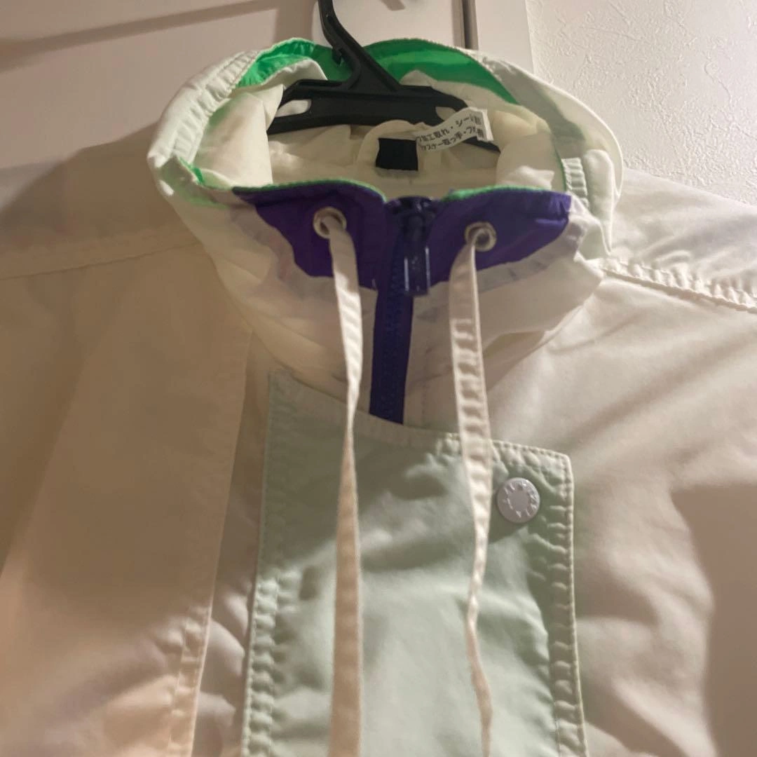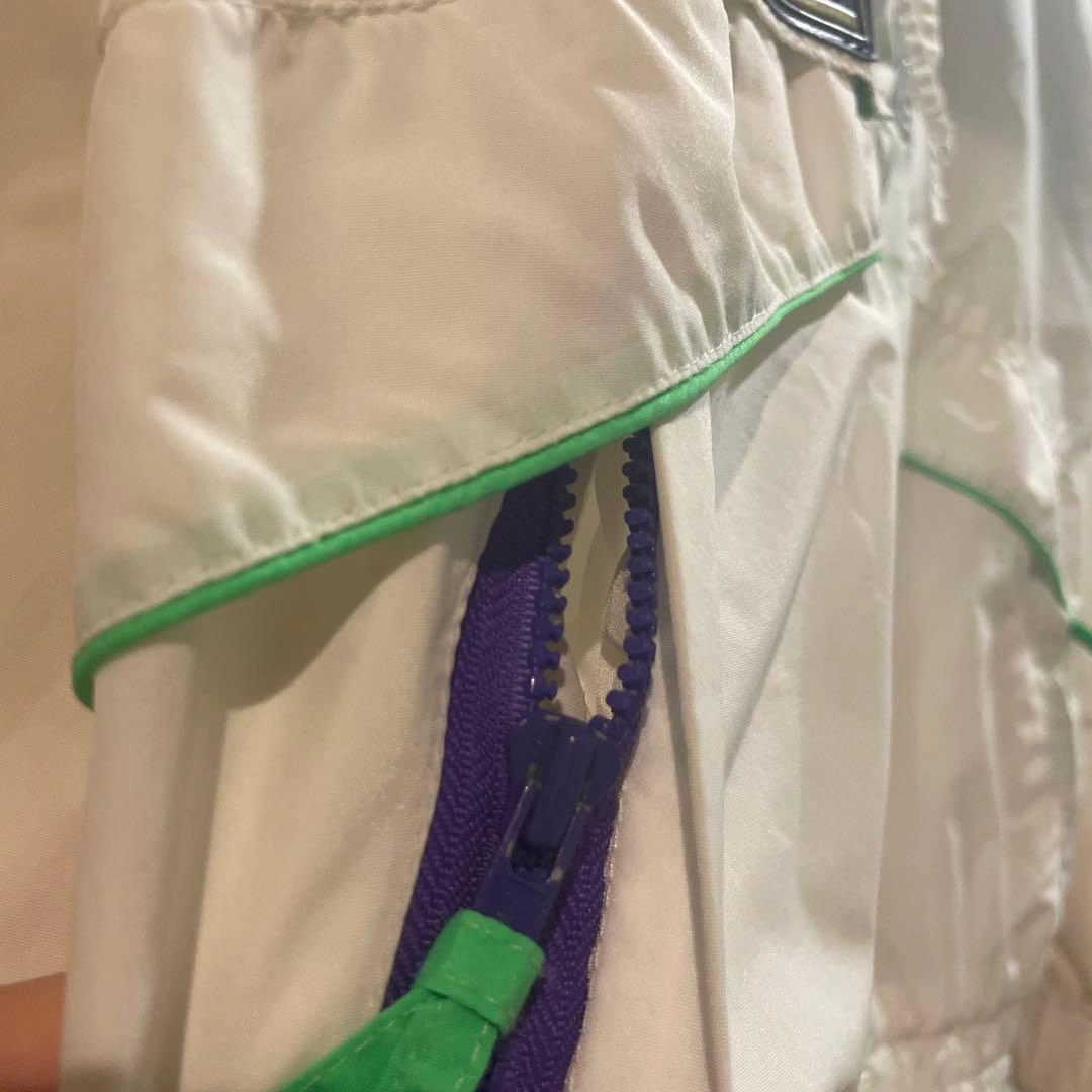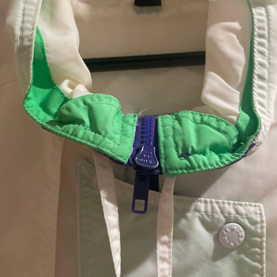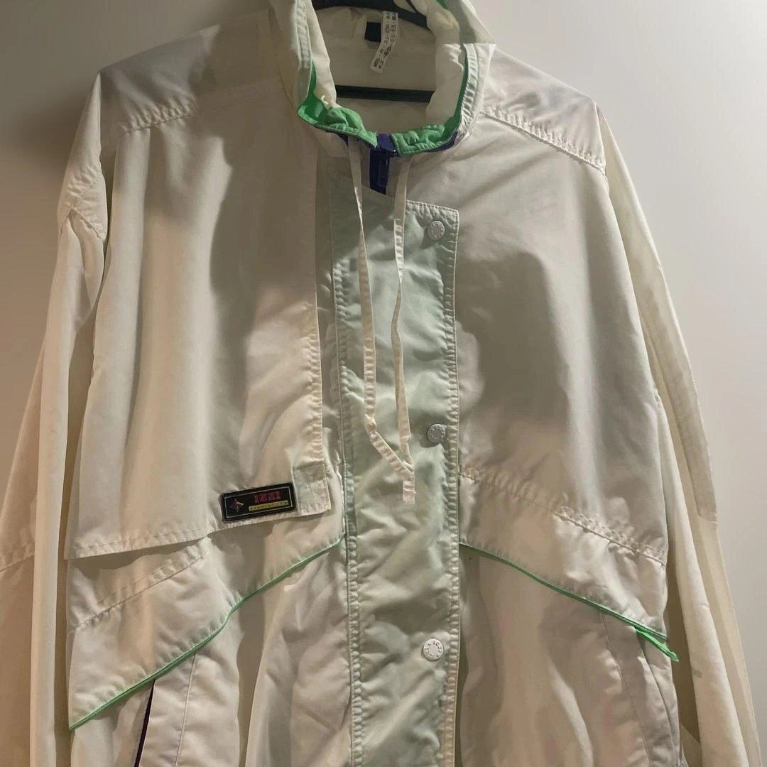 IZZI シェルジャケットです。 比翼仕立て、切り返しデザインで、トレンチコートのような雰囲気もあります。 背面はテディジャケットのような動きやすさを重視したデザイ ンです。 よく見ると凝ったデザインで、ホワイトベースですがエヴァンゲリオンのようなカラーリングも特徴です。 カラー:ホワイト、グリーン、パープル サイズ:M 素材:シェル ポリエステル100%、ライニング ナイロン100%、ニット ポリエステル100% 状態:ホワイトのため、汚れや使用感があります。内側のブランドタグの剥がれ、手首や全体的な黄ばみ、ほつれがあります。穴や破れ、チャックに問題はないので着用可能です。 他に質問等あればお気軽にコメント欄より宜しくお願い致します。 汚れ・破れ・臭いなど···あり ご希望の方はお気軽にご連絡ください。 【お渡し場所】 ファミリーマート大田千鳥3丁目店前 【取引日時】金曜•日曜以外 平日13時以降 監視カメラがある場所なので夜(22時迄)でもかまいません。上記の条件に合わせてくださる方を優先させていただきます。(早いもの勝ちではありませんのでご了承ください)
