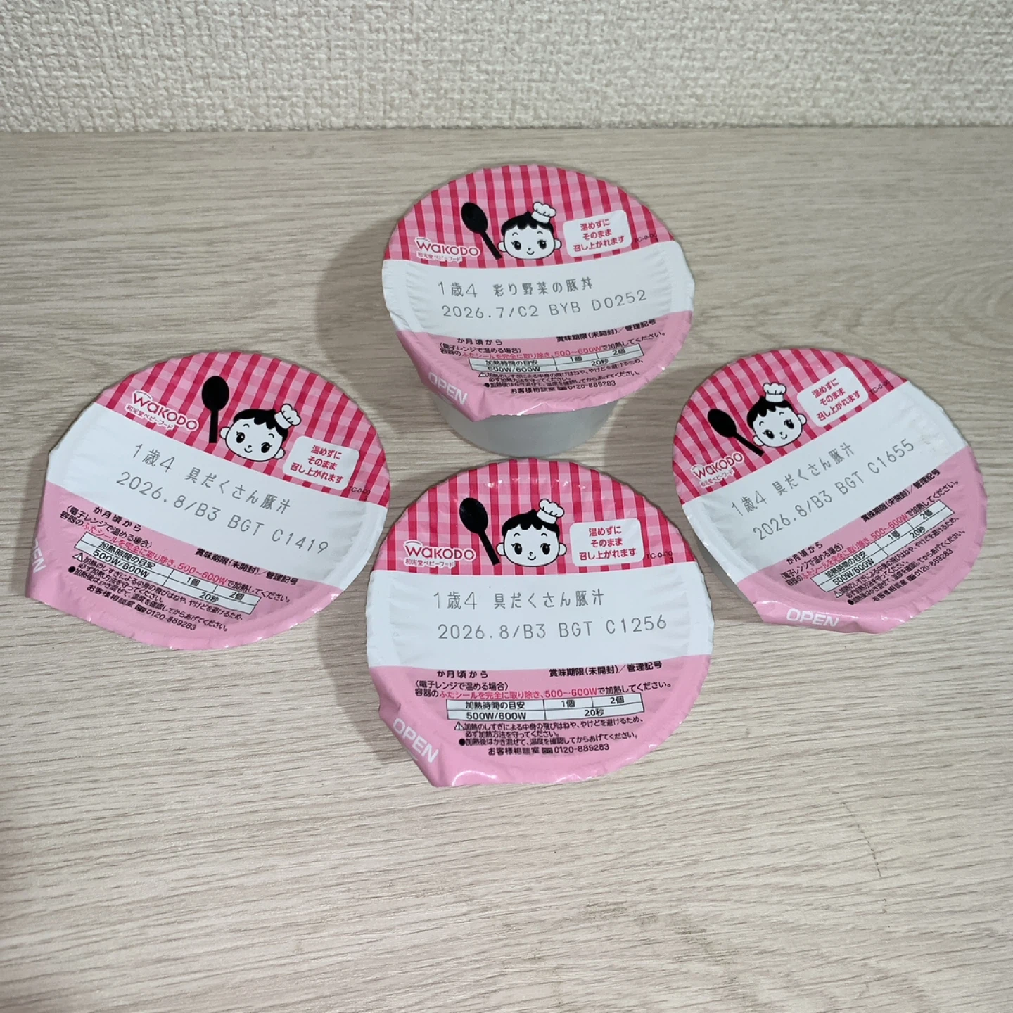 和光堂の1歳4ヶ月頃からのベビーフードです。 具だくさん豚汁3個と彩り野菜の豚丼1個になります。 ・ブランド:WAKODO ・種類:ベビーフード(豚汁、彩り野菜の豚丼) ・対象年齢:1歳4ヶ月頃から ・賞味期限:2026年7月、2026年8月 ・状態:未開封 好き嫌いが多く子供が食べなかったため出品します。