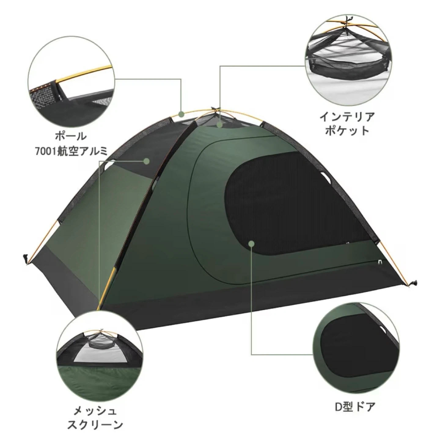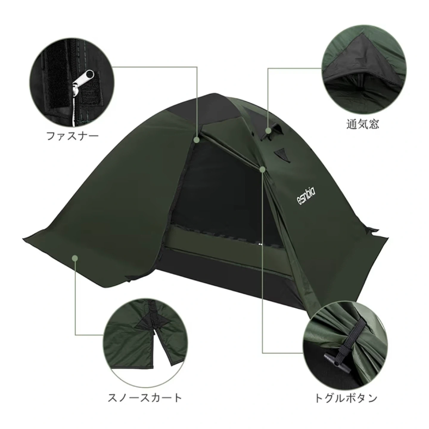 13.14日優先 まとめてお取引してくださる方はお安くします。 ※そのままのお渡しとなります。 ESNBIAの2人用テントです! アウトドアやキャンプにおすすめです! サイズ:約220cm*160cm*110cm 総重量:約3.05kg 梱包サイズ:55x16x16cm ※ペグだけありません。 数回使用しました、少し傷や汚れがあります。 雨に強い素材 フライシートでインナーテントをかぶせれば、フルクローズになりますので、 プライバシーを守ることができます。 窓に二つ防水デザインのメッシュが付き、必要がある場合閉めることもできます。 フライシートは多少の雨や紫外線が防げ、耐水圧は約4000mmです。 風が入るメッシュ素材 前後出入り口はメッシュ素材の窓が付き、防虫でき、通気性も優れています。 インナーテントの下部に二つのポケットが付き、上部にもメッシュポケットがあり、携帯電話や財布などの小物がたっぷり収納できます。 アルミポールも高品質素材を採用し、グラスファイバーより軽量で丈夫です。強い風、激しい雨、また寒い雪でも高い安定性を提供できます。 軽量&ゆったりスペース esnbia2人用4シーズンテントの携帯サイズは約55x16cmで、重量が約3キロです。コンパクトで携帯しやすいデザインで、春夏秋冬のツーリング、キャンプ、ハイキング、登山、避難などに適用です。 テントのサイズは約220cm*160cm*110cmで、ゆったりスペースがあり、ソロ・2人・3人などに適用テントです。 【豊富なシーンに適用】 キャンプ、ビーチ、登山などのアウトドアイベントに適用します。設置も持ち運びも簡単なので様々なシーンで大活躍です。 自然に似る色を使用するため、森や山に隠されて獣の侵入を減らすことができます。 また、防災時の緊急用品として、家に置いて準備することもおすすめです。 注:テント素材性質のため、色の深さは光の強度によって多少変化してきます。