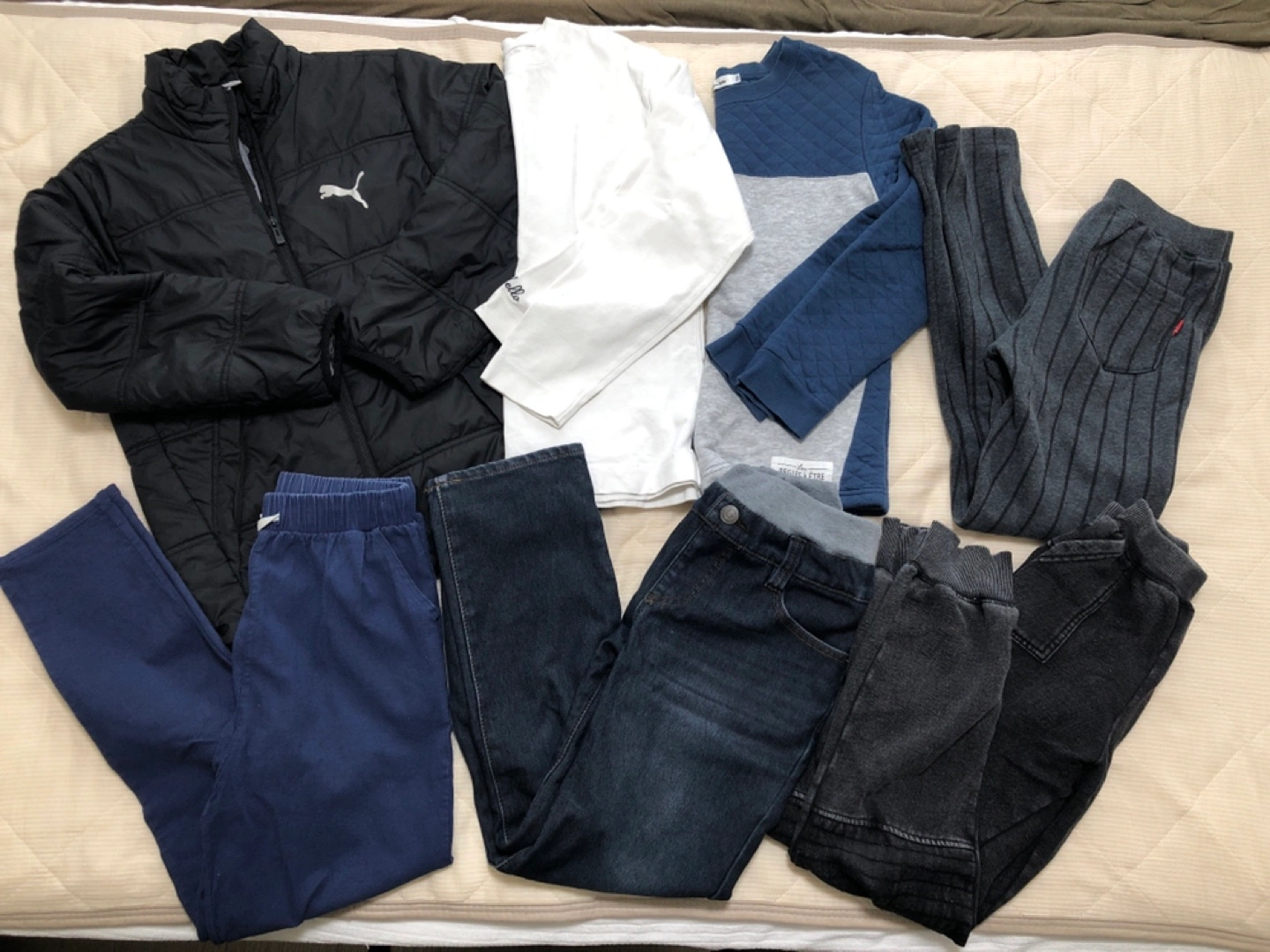 プーマ上着を含むセットです。 140〜150㎝頃に着てました。 パンツは全てウエストゴムです。 ◉裏起毛の3点 140 ×2点、150×1 (デビロックや、イオン のびるっちデニムあり) ◉裏起毛なし1点 (こちらのみMサイズと表記されてますが、同じ頃に着てました) の計4点入ってます⭐︎ その他は合わせやすい白のカットソー、べべの2トーンのトレーナーです。 (べべのトレーナーの前面に落ちないシミあり) usedにご理解くださる方に。