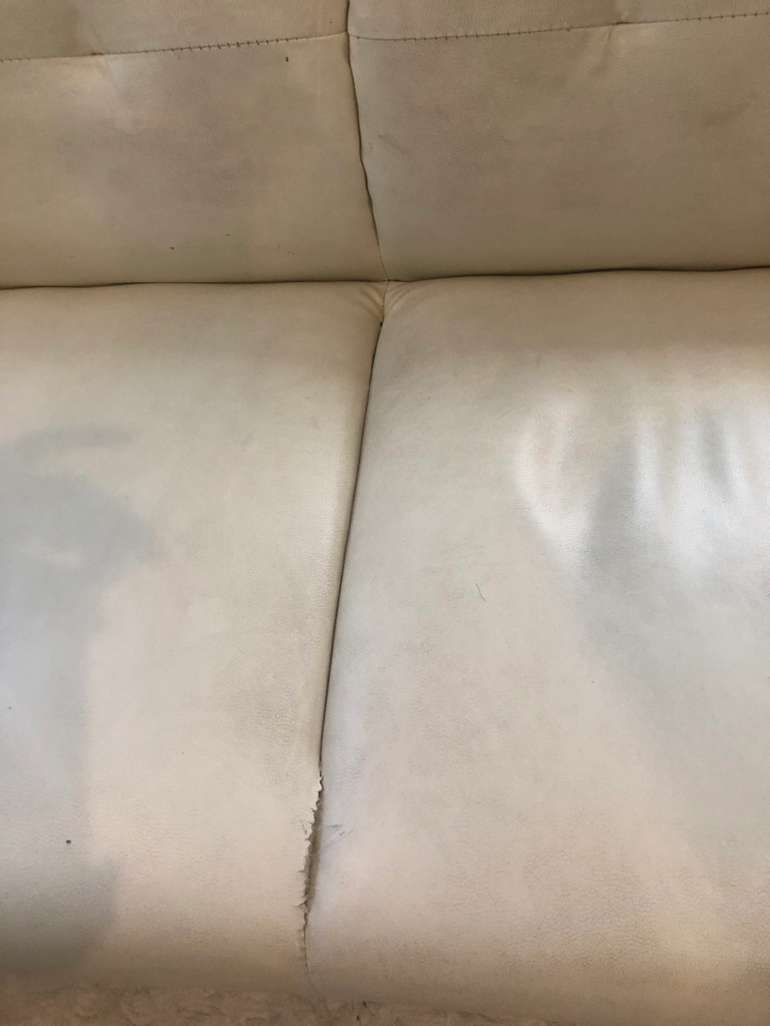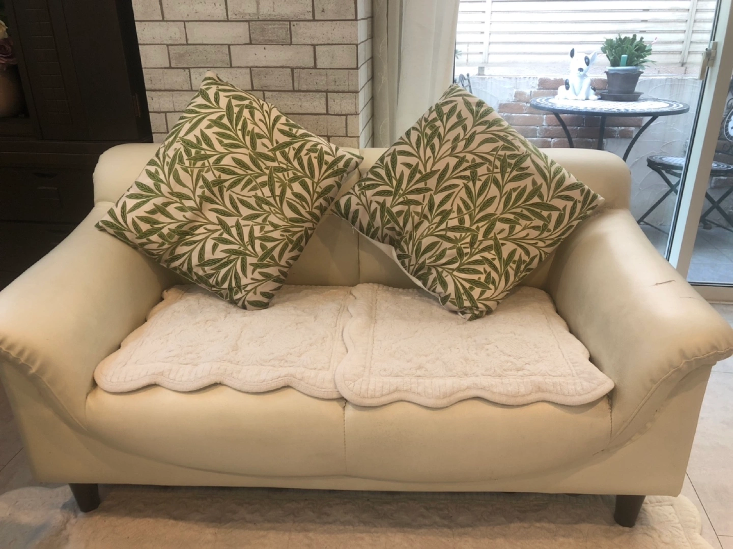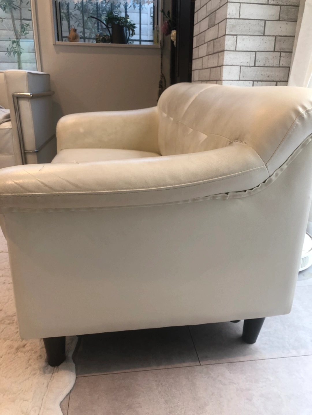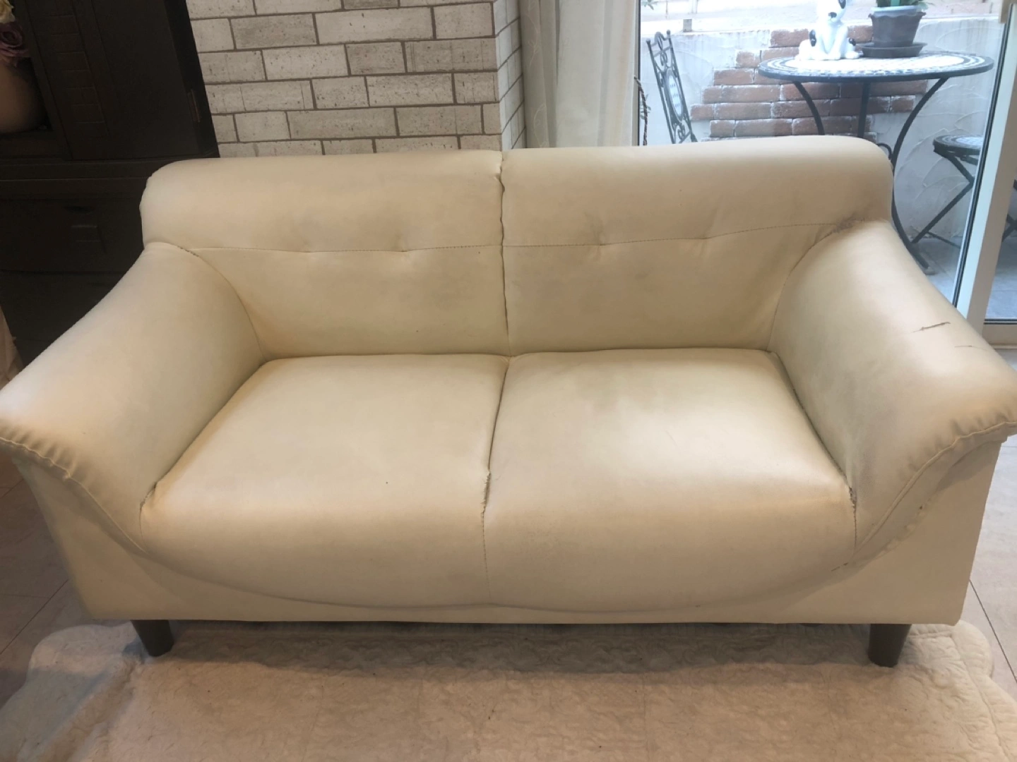 アイボリー2人掛け用ソファです ソファ買い換えにより不要になりました 座面はヘタリもなくしっかりとしているので座り心地も良く楽で気に入っていました(お昼寝にも重宝です) 画像の様に縫い目等に破れが数箇所有りますがブランケットを掛けたり座面に薄手のクッションを敷いて背中にクッションを置いたりしてして本日まで現役で活躍していました 処分するには忍びなく其れでも良いと思う方どうぞどうぞ。サイズ 125x62cm 座面まで33cm 画像5は今まで使用していたイメージです お渡しするのはソファのみになります