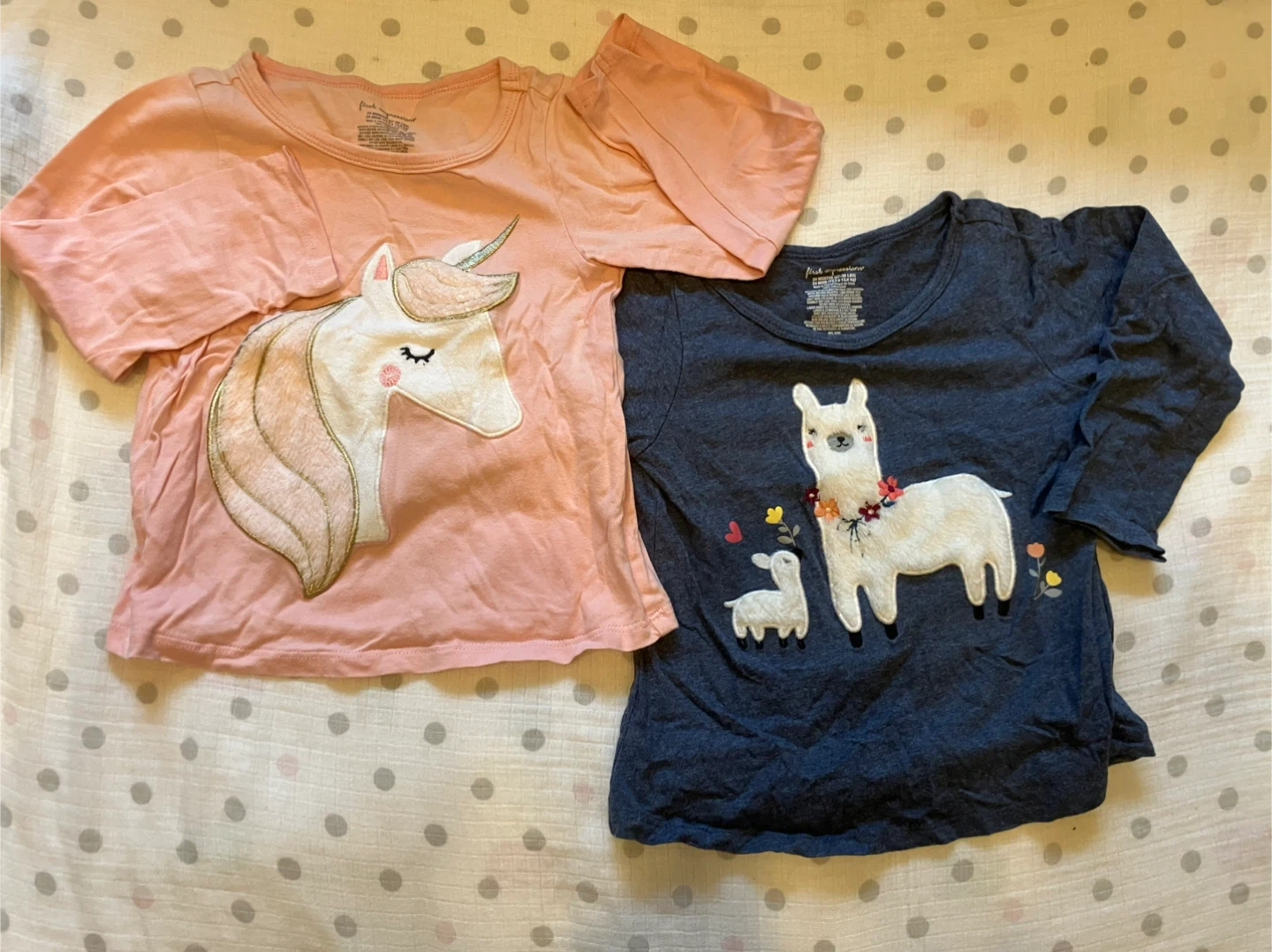 2歳 薄手長袖シャツ 2枚セット アメリカで購入したものです。 薄手なので、1枚でも着られますし、インナーとしても使えます。 とても可愛い柄で、ユニコーンのたてがみやアルパカの毛がふわふわしており、子供がとても気に入っておりました♡