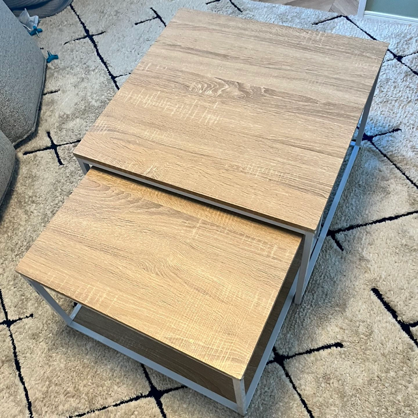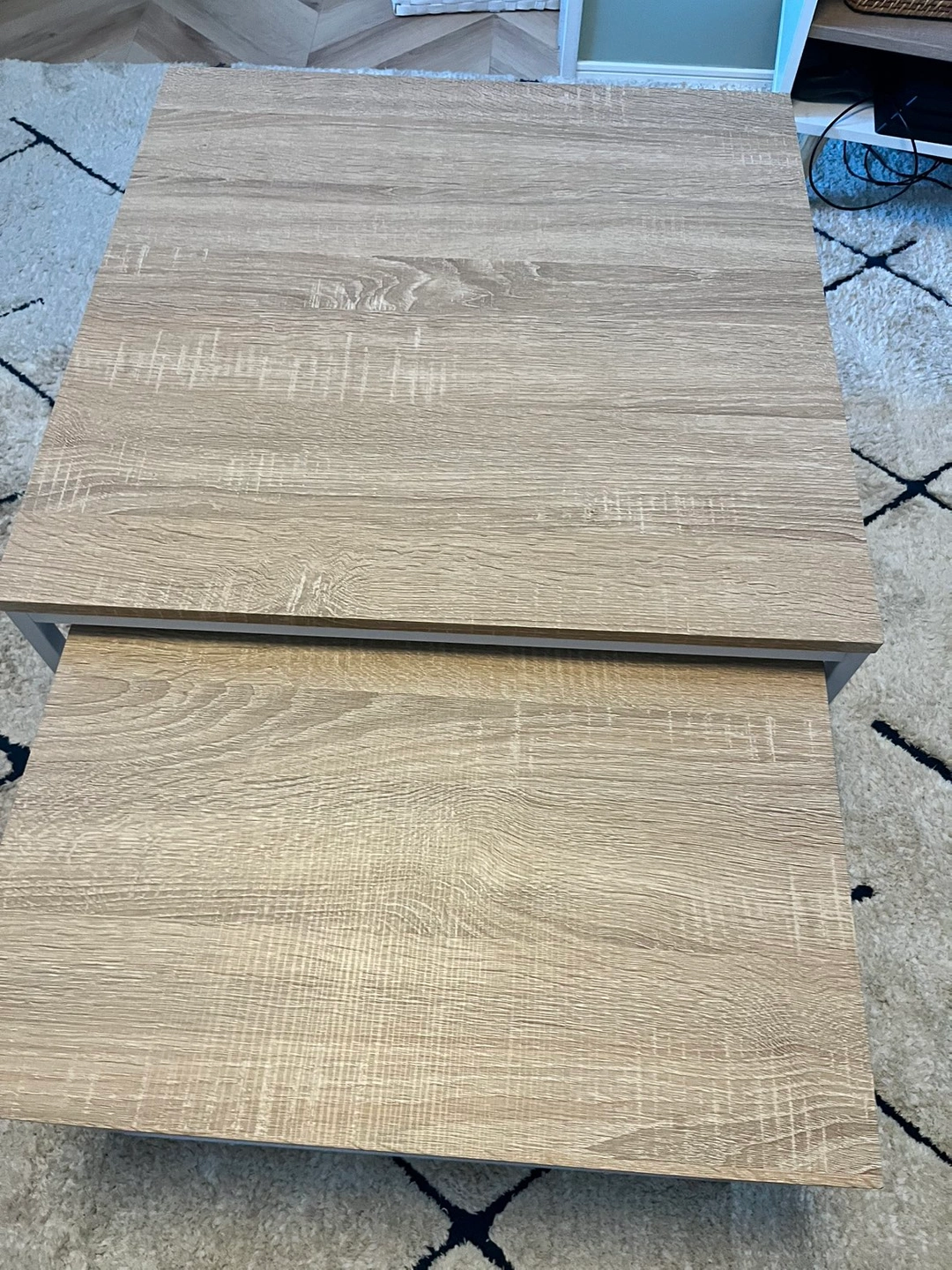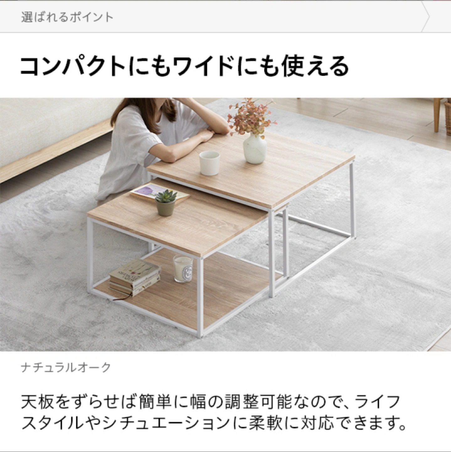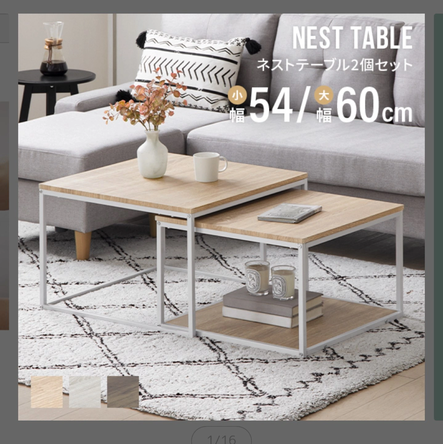 ネストテーブル ローテーブル テーブル センターテーブル 伸縮 おしゃれ リビングテーブル コンパクト 無垢材風 モダン シンプル ワイド 一人暮らし リビング 収納 棚 正方形 収納付き スライド 韓国インテリア 購入価格:9998円 (2023年12月 楽天 モダンデコ) 奥行き 大60センチ 小54センチ 高さ 大40センチ 小35センチ 天板 木目プリント紙(ナチュラルオーク) 脚 スチール(白)錆防止のパウダーコーティング有り 組み立て済み(未解体) 中古品のため細かい傷や使用感あります。 ご理解いただける方にご購入していただきたいです。 配送に関してはご相談ください。日にち次第ではありますが、車でお届けすることもできます。 ペットなし喫煙なし