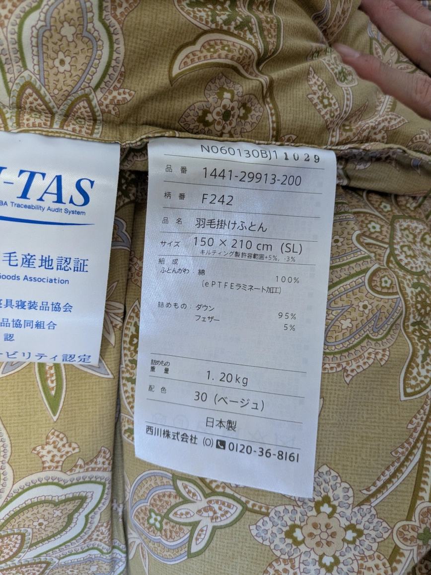 23日㈫まで限定!!【西川】未使用 GORE 羽毛掛け布団 ベージュ