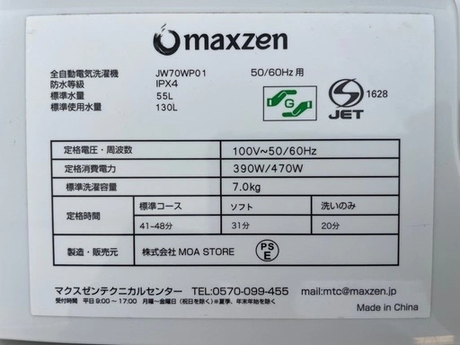 あたたかさMAXZENの全自動洗濯機、JW70WP01、2019年製です。 【商品の状態】 総合:◯ 動作:◎ 傷:◯ 汚れ:◯ におい:◯ 年式:▲ ※状態は個人の感じ方により異なりますので、参考程度にお考えください。 清掃はしておりますが、写真では確認しづらい傷や汚れがある可能性があります。 写真の情報が全てです。 中古品にご理解頂けない方はご購入はお控えください。 返品やキャンセルは受け付けておりません。 【お渡し場所】 横浜市港南区 【概要】 シンプル仕様の縦型全自動洗濯機です。風乾燥機能付き、容量7kgで一人暮らし~二人暮らし向けです。 【主な仕様】 容量:洗濯7.0kg 外形寸法:幅 565 × 奥行 534 × 高さ 835 mm 質量:30 kg 水道水圧:0.03 ~ 0.8 MPa 電源:100V、50/60Hz 共用 標準水量:55 L 標準使用水量:130 L(洗濯・すすぎ時) 消費電力:390W(50Hz)/470W(60Hz) コース例:標準/ソフト/強洗/毛布/洗濯槽洗浄/風乾燥など 風乾燥機能付き(脱水後に風で乾かす方式) 【特徴】 風乾燥付きで“ある程度乾燥”の補助ができます。 操作や仕様がシンプルでわかりやすいです。 コンパクトな設置サイズで、置き場所を選びやすいです。 水量自動調整センサーあり(布量検知) 上開き/縦型の撹拌式タイプ 【オプション】 ・配送料:5,000円〜 ※場所により異なります。詳細はお問合せください。 ・時間指定:0円〜 ①9:00〜12:00 ②12:00〜15:00 ③15:00〜18:00 ④18:00〜20:00 ⑤いつでも ・下取り:0円〜 ※商品により買取出来る場合があります。