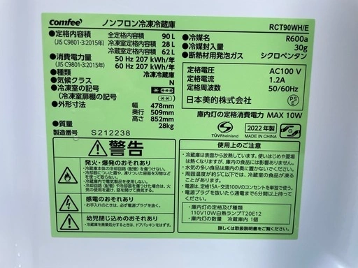 【2512002】COMFEE’(コンフィー) 冷蔵庫 RCT90WH/E 2022年