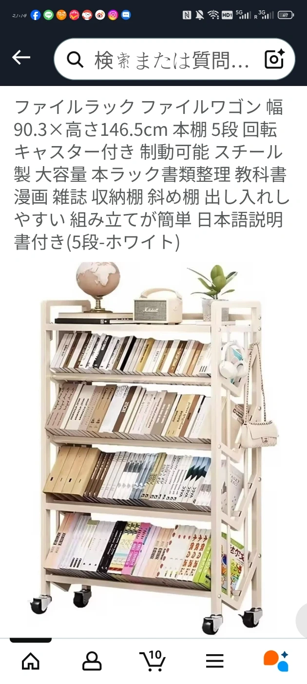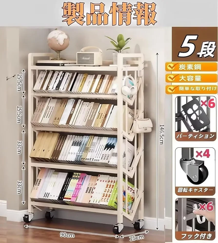 ファイルラック、本棚です。 耐荷重:棚1段あたり約30kg 製品サイズ より大きく、より実用的なサイズ 梱包は持ち運びしやすいようにテープでしっかりとまとめており、梱包サイズは「140×27×10cm」です。 素材・材質:炭素鋼(スチール) 付属品:フック(4個) ストッパー付きキャスター ノックダウン組立式 幅90×奥行25×高さ146.5cm ・5段 ・キャスター付き ・フック付き 写真のとおり現状品です。開封はしましたが、実際には使用していません。 部屋のサイズに合わなかったため出品いたしました。ご了承ください。