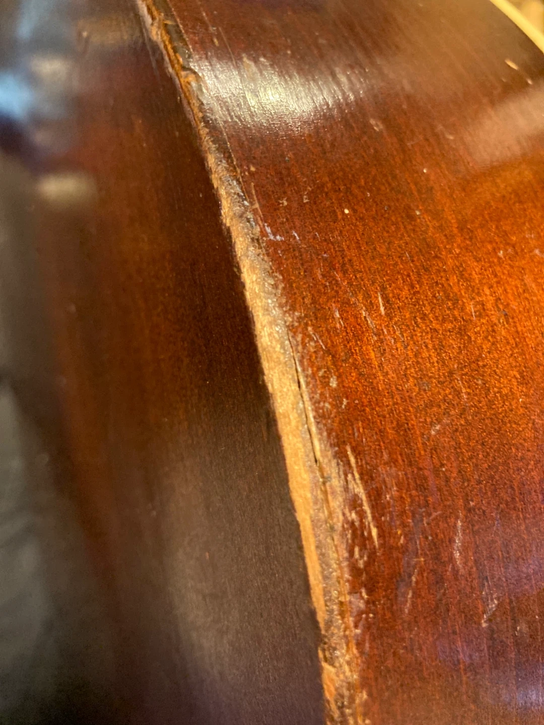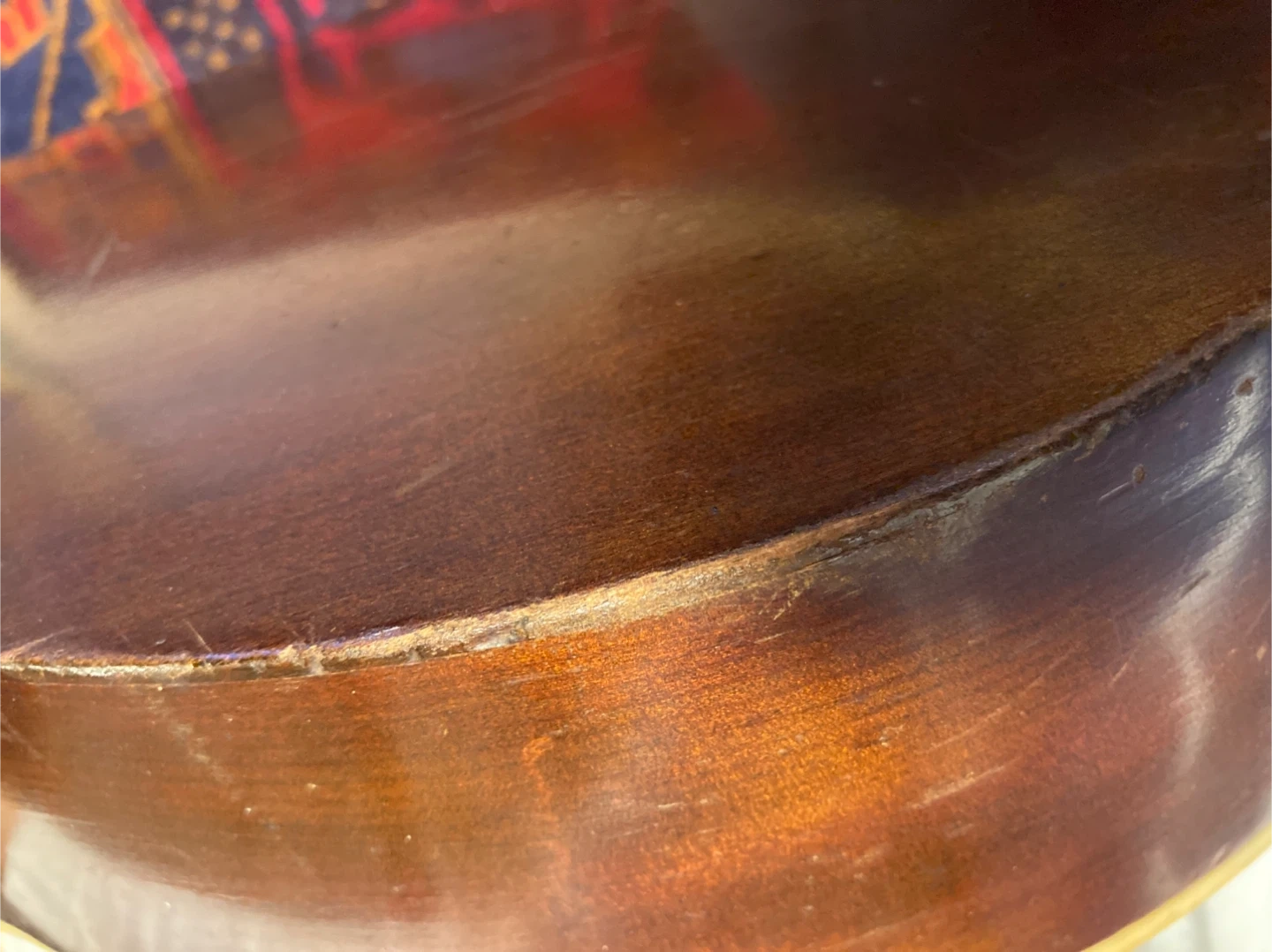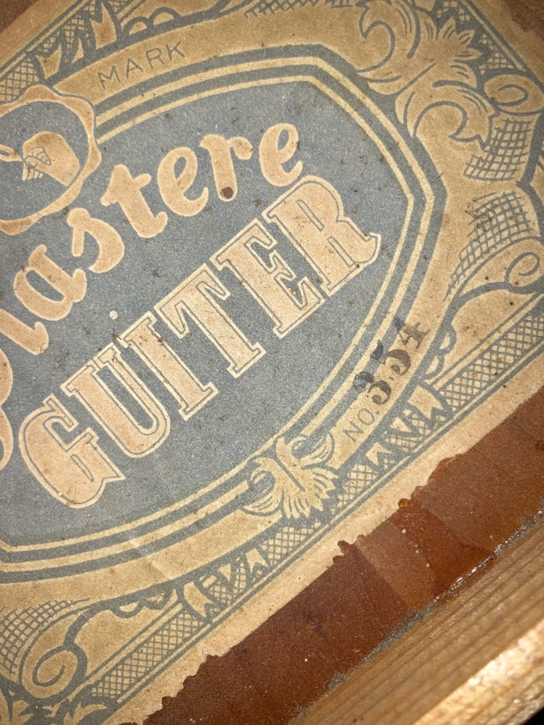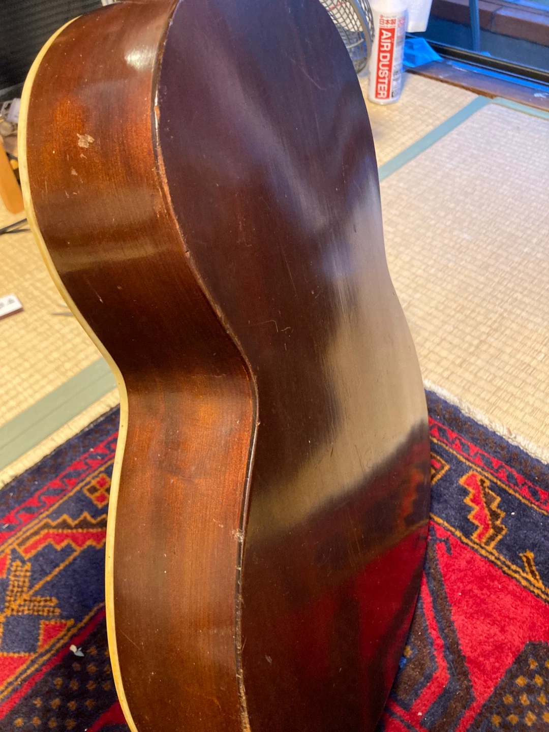 50年代日本製と思われるクラシック(ナイロン弦)ギターです。 表板裏板は多分単板で、薄めやや小ぶりのサイズに反してよく鳴ってます。 乾いた音ですね。 全体をきれいに清掃してオイル等塗布した後新品弦にはりかえてます。 ビンテージというかもはやアンティークな雰囲気すらあるので、お店のディスプレイとかインテリアにもいいかもしれません。できれば弾いて欲しいですが…。 難点としては5・6弦10〜12フレットに強いビビリがあります。またボディエンド側にストラップピン穴が空いています。