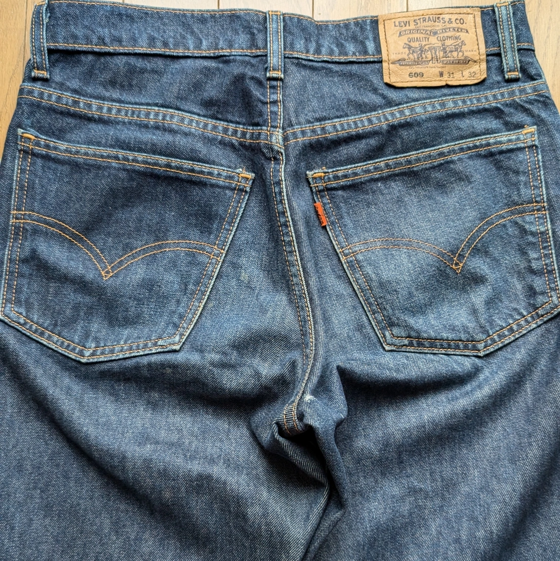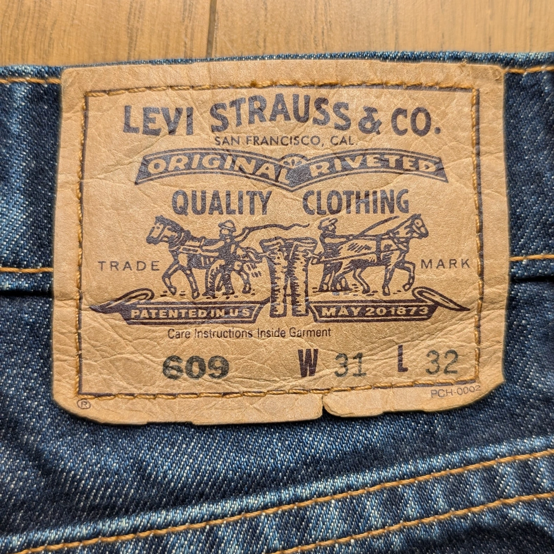あたたかさ以前下北沢の古着屋で購入したものです。 希少な廃番モデルの609です、購入時から股下に微細な破れありましたので裏地当てて補修済みです。 ※タグがかすれておりますが、購入時に撮影したものを載せております。 ウエスト…36cm 総丈…104cm 股下…78cm 股上…29cm 型番...600番台