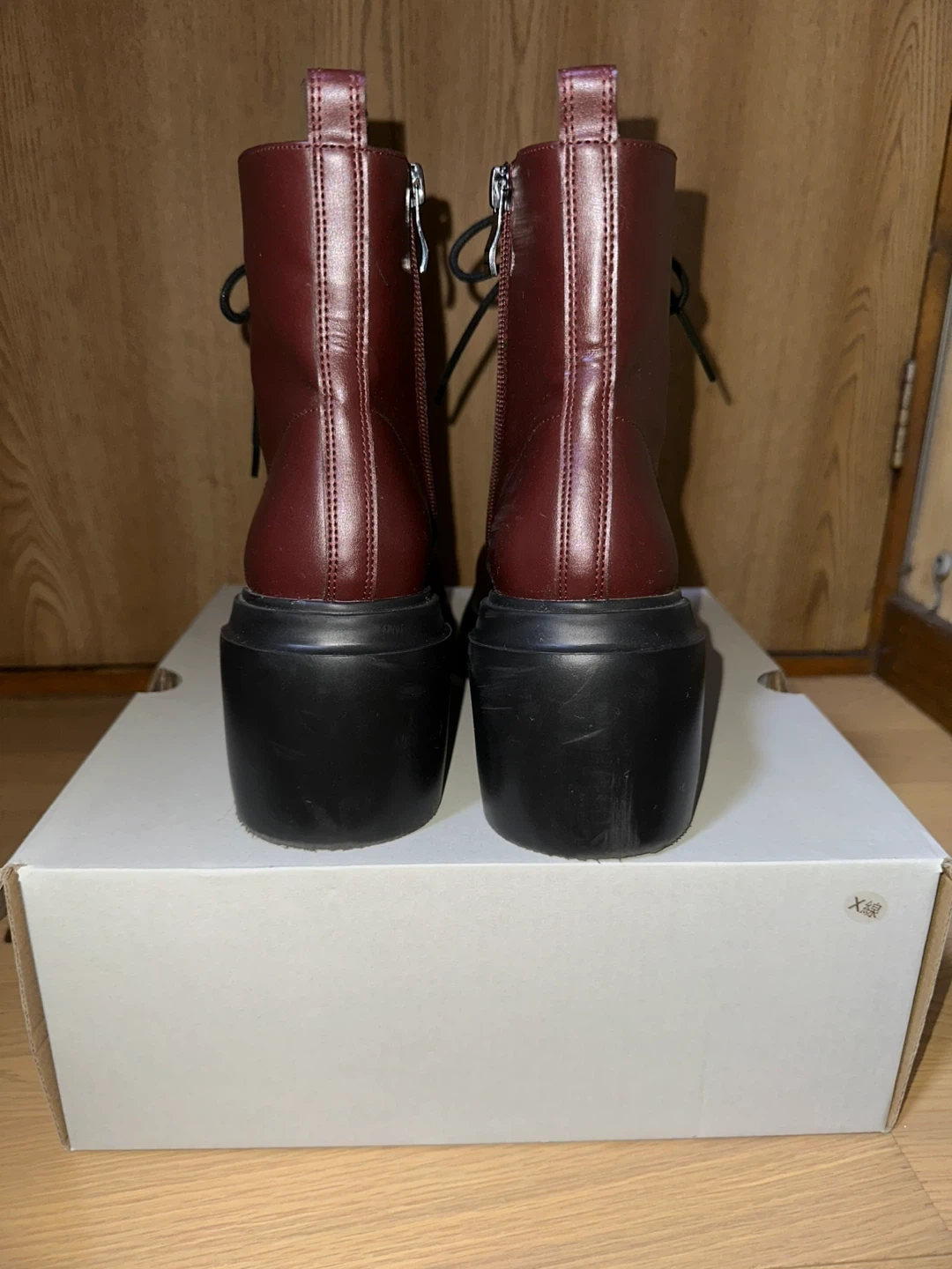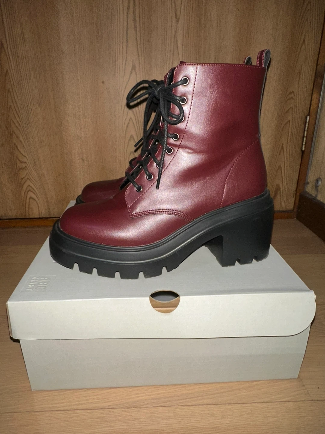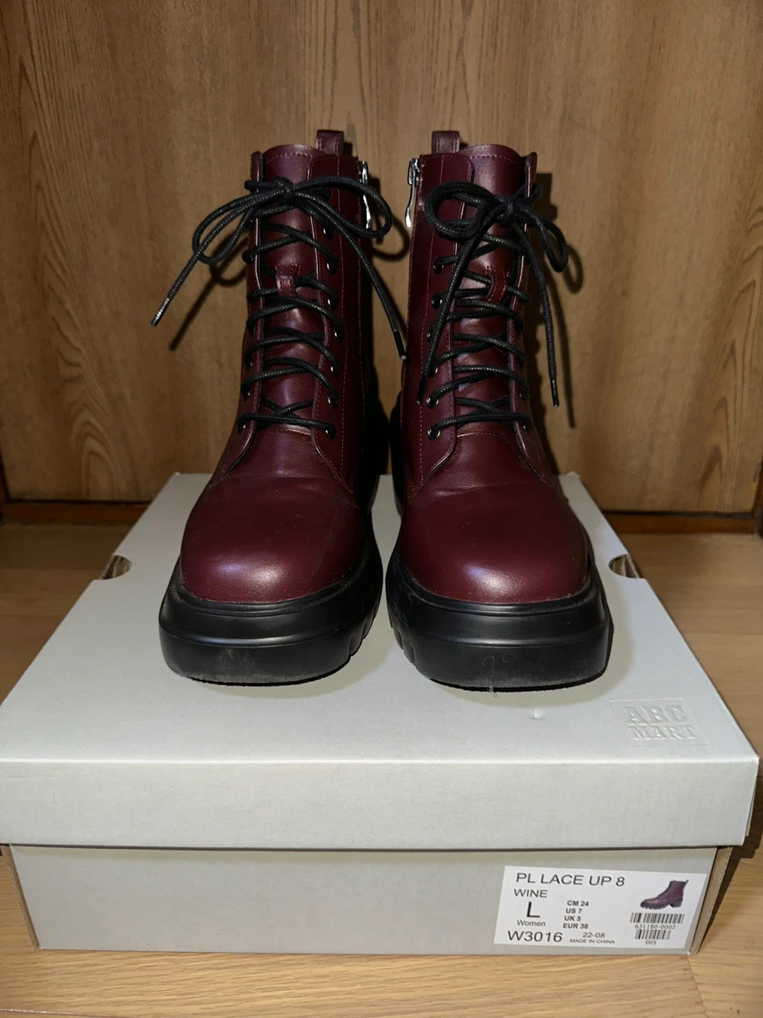ABCマートのブーツです。 【情報】 ブランド:ABCマート 商品名:PL LACE UP 8 サイズ:L(24cm相当) 色:ワインレッド 【状態】 靴底に汚れあり 2回ほど使用しその後は出番がなく自宅保管しておりました。 踵ヒール部分にスレあり 【付属品】 箱 ✨受け渡しは岸根公園 ✨日時は平日のみ(希望仰ってください。) まだまだ履いていただけるかと思います。 素人が検品してます。 中古品であることをご了承ください。