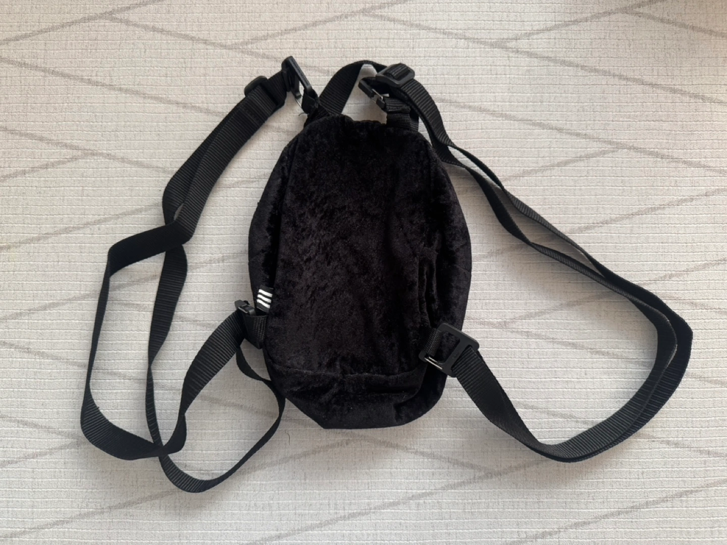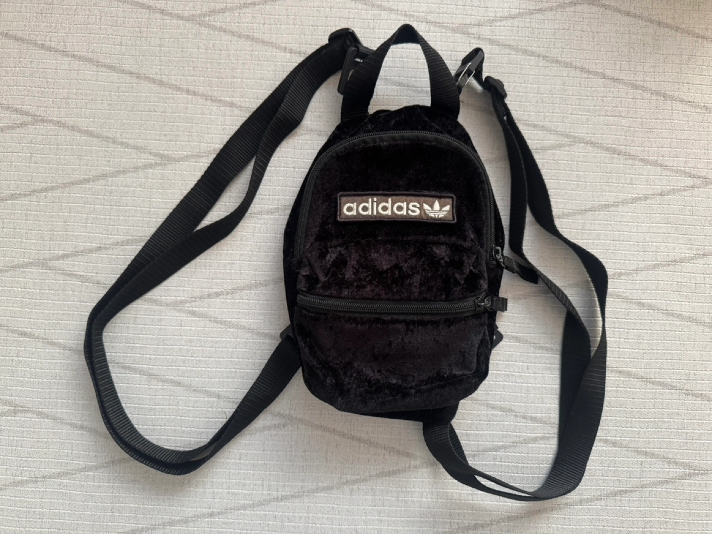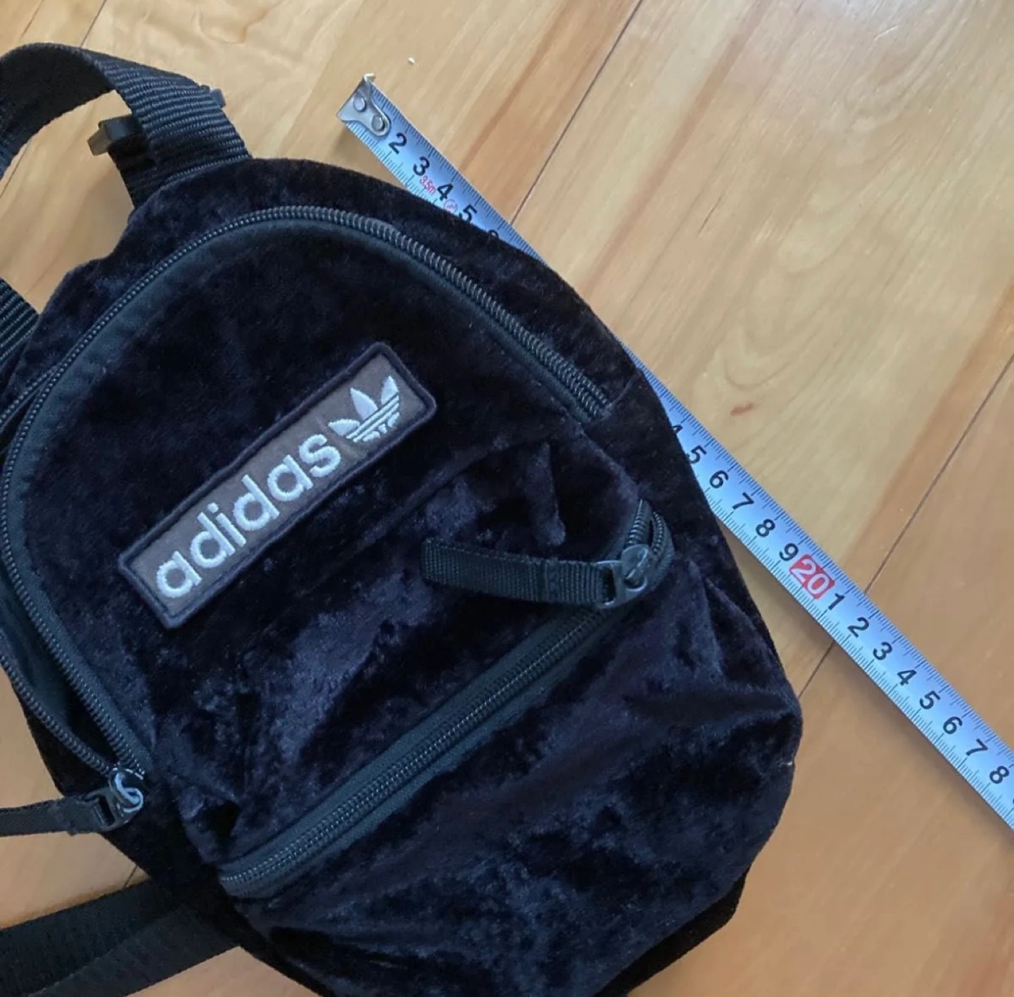 adidasのミニリュック、バッグです。ベロアっぽい素材です。 子どものリュックとして使用しようとフリマサイトで購入しましたが結局使用することなく。 購入時よりチャックの塗装のハゲはありましたが他は大きな汚れ等ないかと思います。 カバン自体は小さめサイズですが紐の長さは調整できますのでもちろん大人の方もご使用頂けます。 サイズは6枚目の写真ご参照ください。