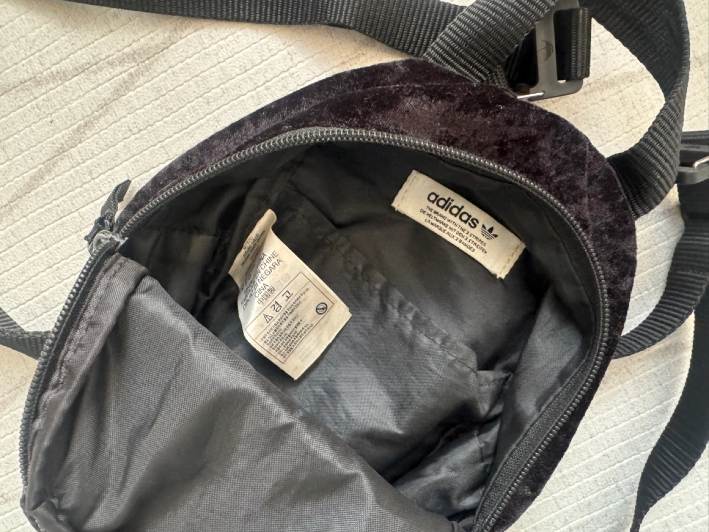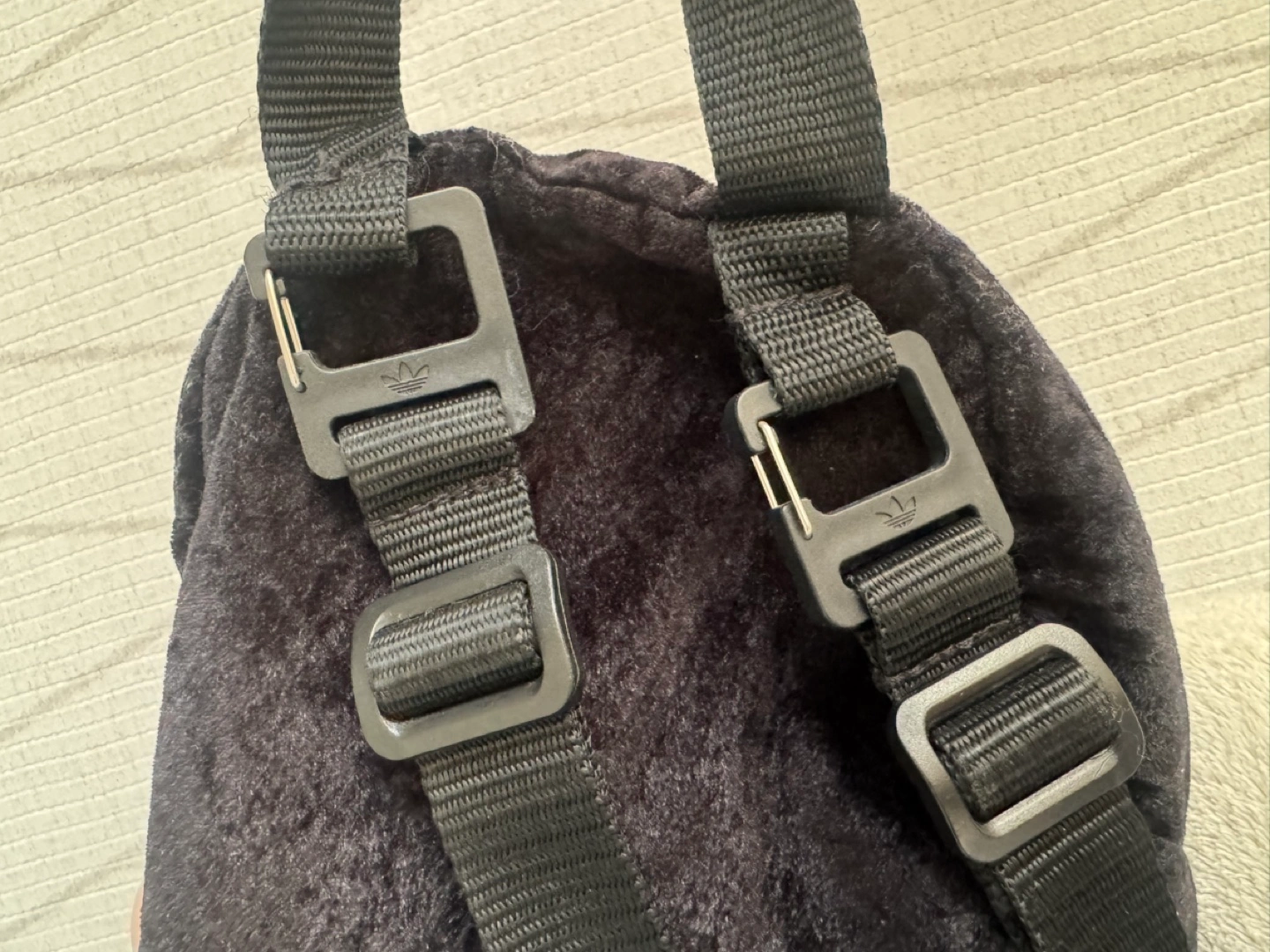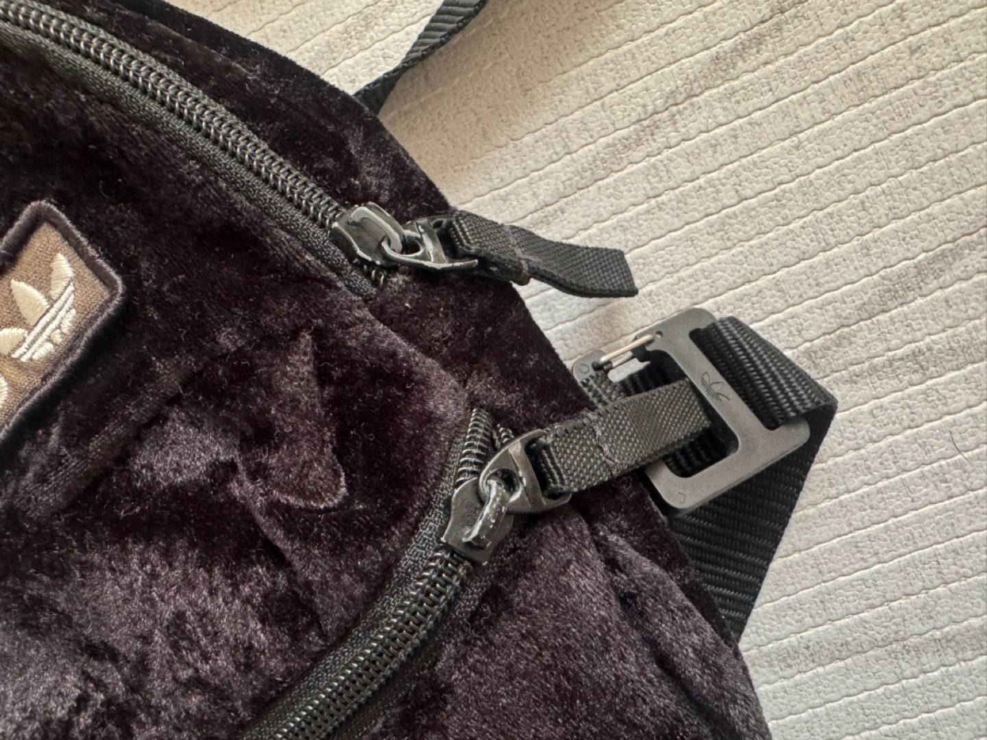 adidasのミニリュック、バッグです。ベロアっぽい素材です。 子どものリュックとして使用しようとフリマサイトで購入しましたが結局使用することなく。 購入時よりチャックの塗装のハゲはありましたが他は大きな汚れ等ないかと思います。 カバン自体は小さめサイズですが紐の長さは調整できますのでもちろん大人の方もご使用頂けます。 サイズは6枚目の写真ご参照ください。