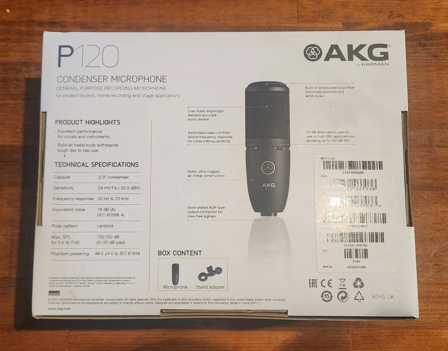 AKG P120 コンデンサーマイクです。 【情報】 ブランド:AKG(エーケージー) 種類:コンデンサーマイク 型番:P120 【状態】 目立つ傷や汚れは見られません。 開封しましたが、試しで接続したのみとなっており、その後は自宅で保管しておりました為、ほぼ未使用の美品です。 【付属品】 マイクスタンドアダプター、説明書 中古品であることをご了承ください。