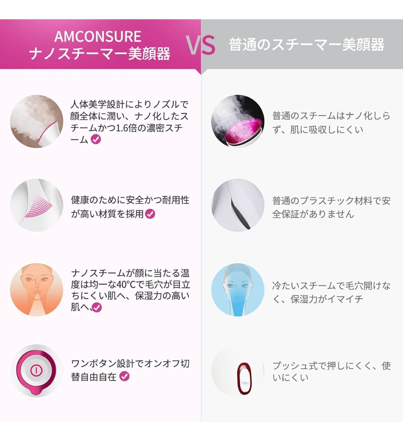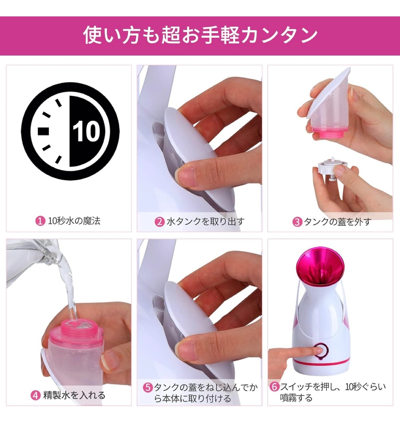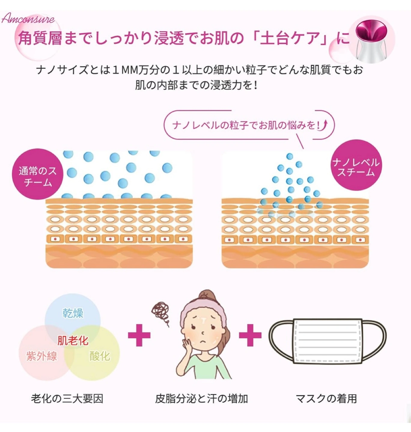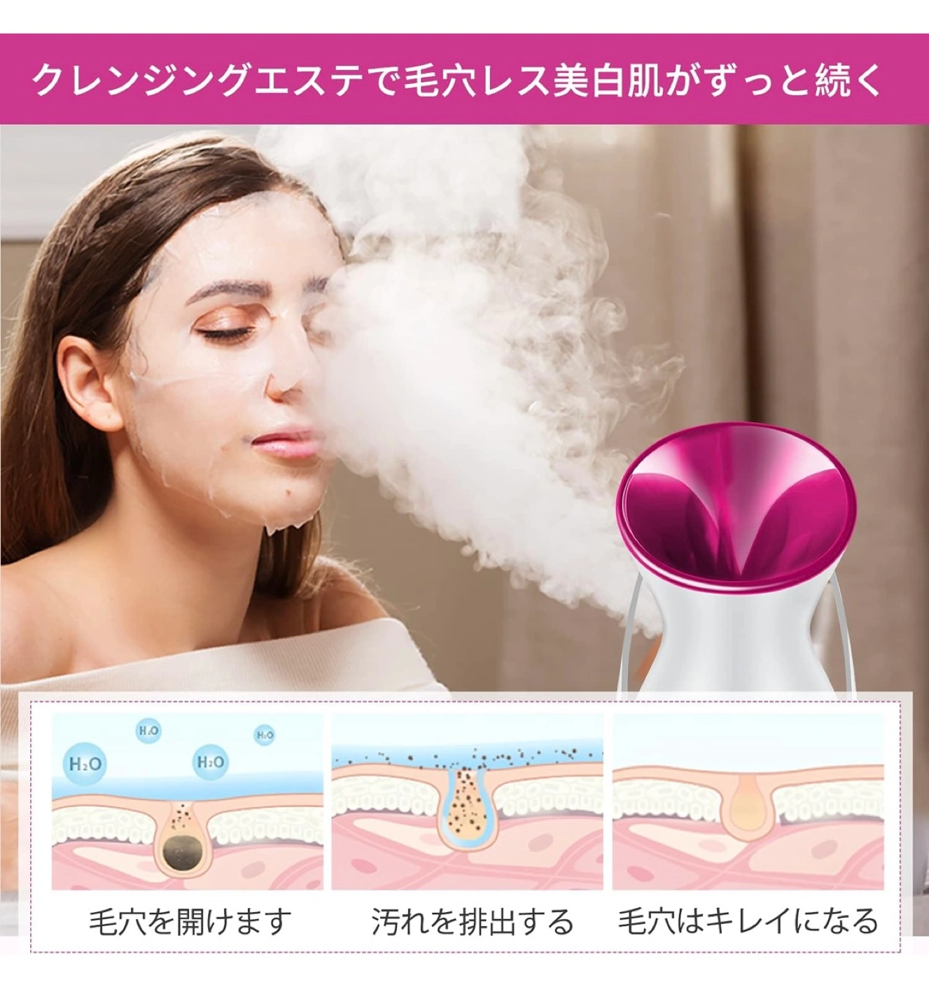 Amazonで購入しましたが、2-3回使っただけでしまっていたものを引越しを機に出品いたします。 ※出品にあたり動作確認のため一瞬だけ使用してみましたが問題なさそうでした。 定価:3,980円 目立った傷や汚れなどはございませんが、気になる方はご遠慮ください。 箱はなく、本品+付属していたヘアバンド+説明書を紙袋等に入れてのお渡しとなります。 中古品であることをご了承の上、ご購入くださいませ。 ご不明点などございましたらお気軽にお尋ねください。 以下、商品説明です。 【保湿ケア&クレンジングエステ】 一年中に不可欠なスキンケアステップは保湿です。 美肌スチーマーは安定したスチーム量1.6倍の濃密スチームで顔を柔く包み込み、潤い持続同時にクレンジングエステで毛穴レス美白肌へ。 【ナノ微粒化技術&PTC加熱技術】 フェイシャルスチーマーは水を1MMの100万分の1以上の細かい粒子のナノ水分子に変換するため 角質層より深く基底層まで潤い持続! 起動後約10秒で急速加熱でき、長く待つ必要がありません。PTC加熱技術で水滴と結合しにくく、安定感のあるミストを生成します。 【40℃温熱噴霧&全肌質適用】 ビューティースチーマーは肌の土台づくりに最適な温度へと引き上げられるため、どんな肌質でもリッチな浸透を! 美容スチーマーの温かいスチームも柔らかく均一で持久性があって全肌質適用です。 【ワンボタン設計&大容量水タンク】 操作が簡単で、忙しい朝でも保湿できて収納も便利です。スチーマー美顔器は約10分連続噴霧できて、自宅で簡単にフェイススパを楽しめます。 【ブランド】 Amconsureは、美容家電の分野で信頼されているブランドです。高品質な製品を提供し、多くのユーザーに支持されています。