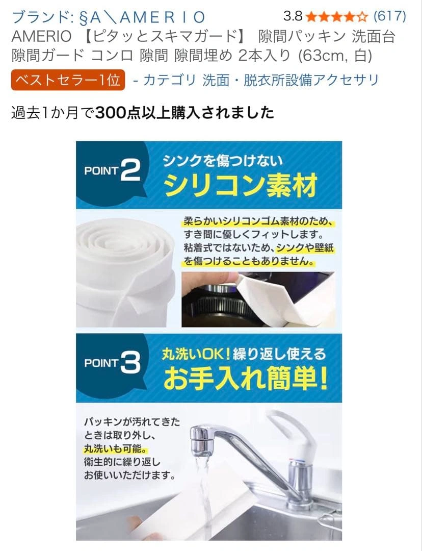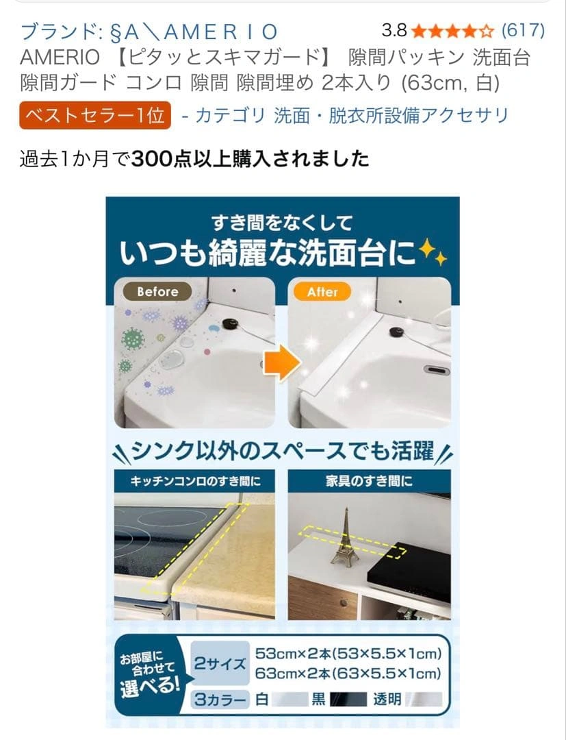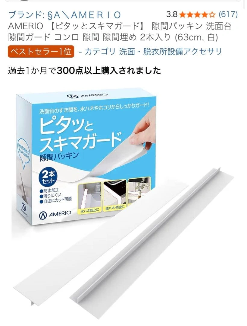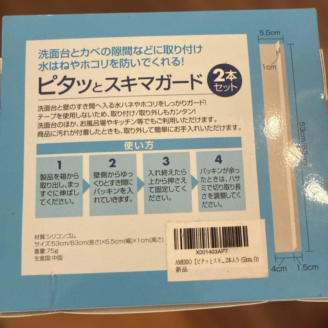 洗面台や家具の隙間を防水・防油するためのパッキンです。 - ブランド: AMERIO - セット内容: 2本セット - サイズ: 63cm×2.5cm×5.5cm - 特徴: 防水加工、油防止、自由にカット可能 ご覧いただきありがとうございます。 ご希望の方はお気軽にご連絡ください。