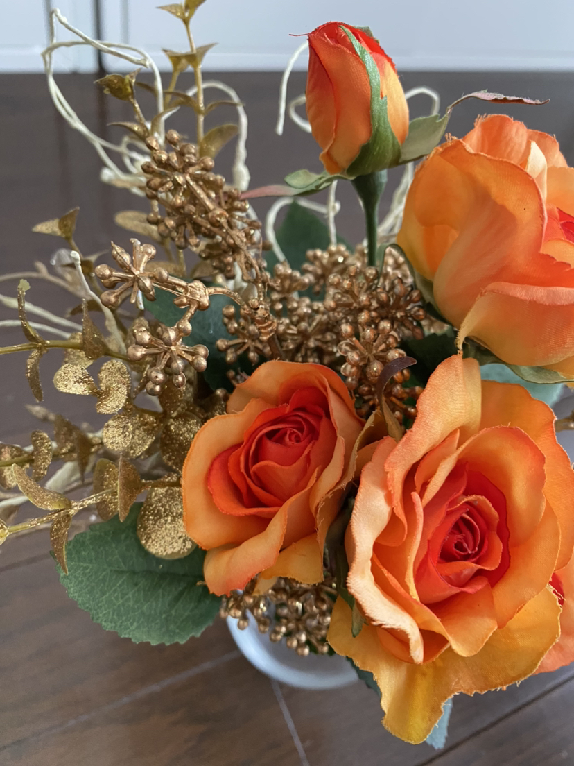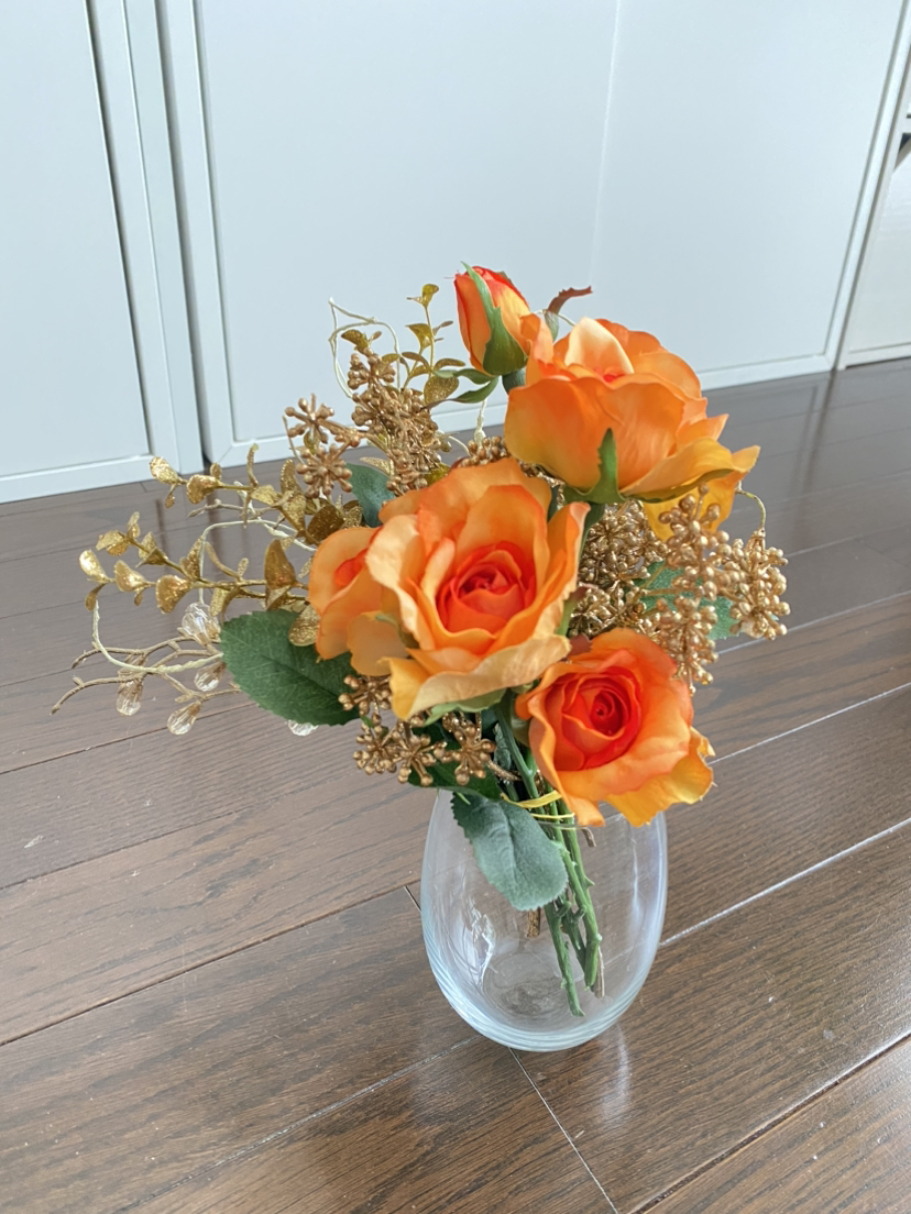 鮮やかなオレンジに眩いゴールドの ミニブーケです💐 造花になります。 お花は簡単に束ねてあります。 完璧な商品というわけでは ございませんのでご理解くださいませ。 下の花器はつきません。 ちょっとしたインテリアに いかがですか? 必要な方にお届けできましたら 幸いです。 よろしくお願い申し上げます♪