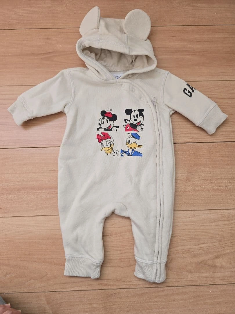 ミッキーと仲間たちのプリントが特徴の耳付きロンパースです。 水通しのみで保管しておりました。 裏起毛で、アウターのようにもこもこしていないので ベビーカー、チャイルドシートのベルト調整などせず乗せられ便利だと思います。 ブランド: baby GAP キャラクター: Disney サイズ: 0-3ヶ月 デザイン: ミッキー・ミニー・ドナルド・デイジーのプリント 特徴: フード付き、耳付き ご希望の方はお気軽にご連絡ください。