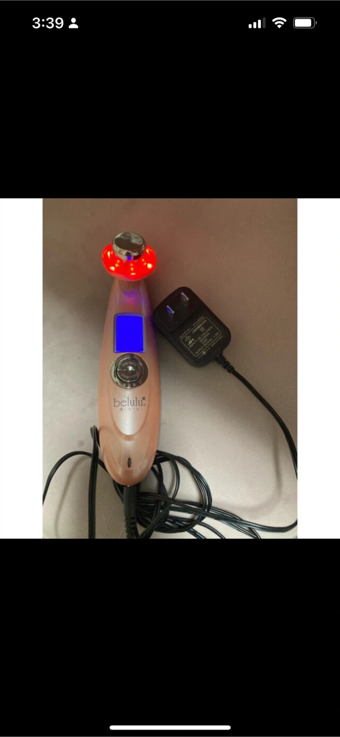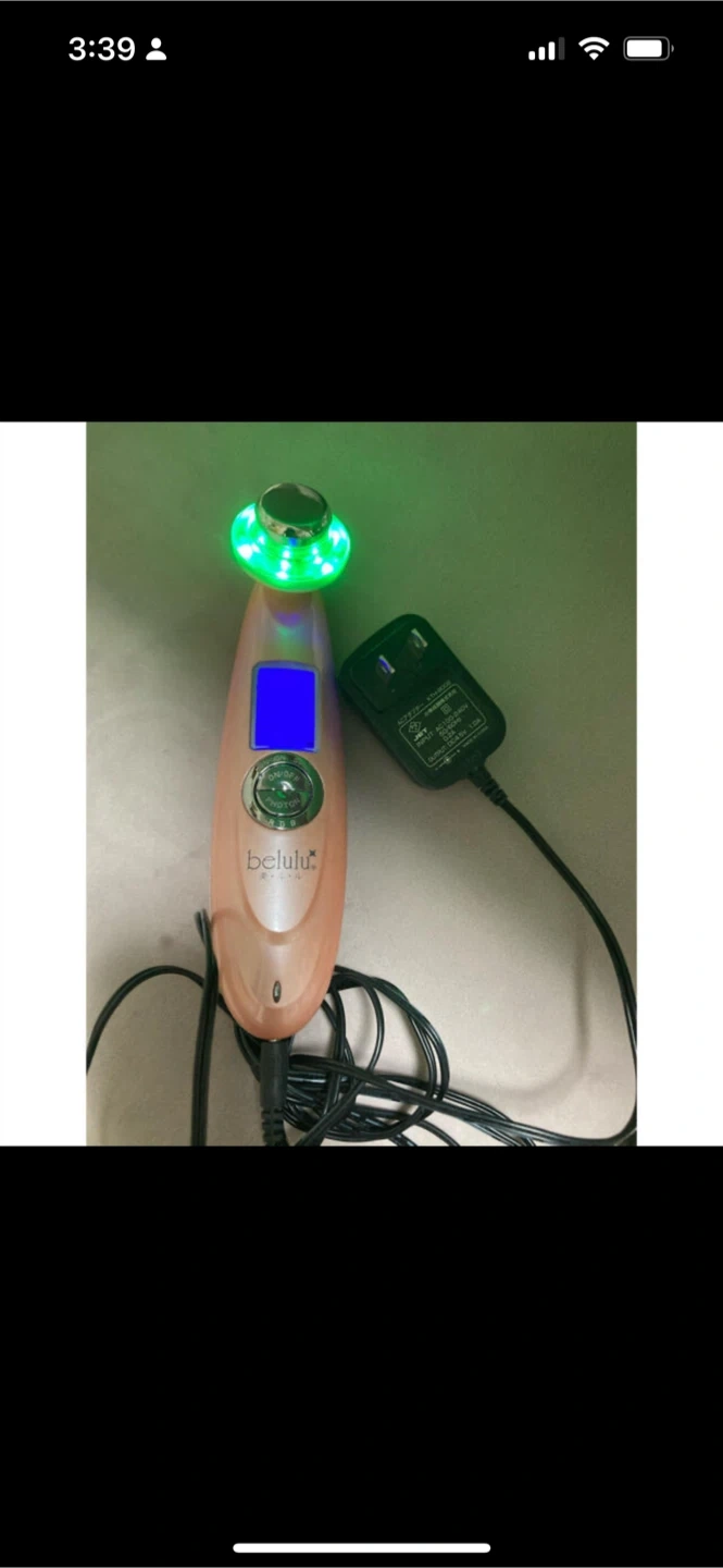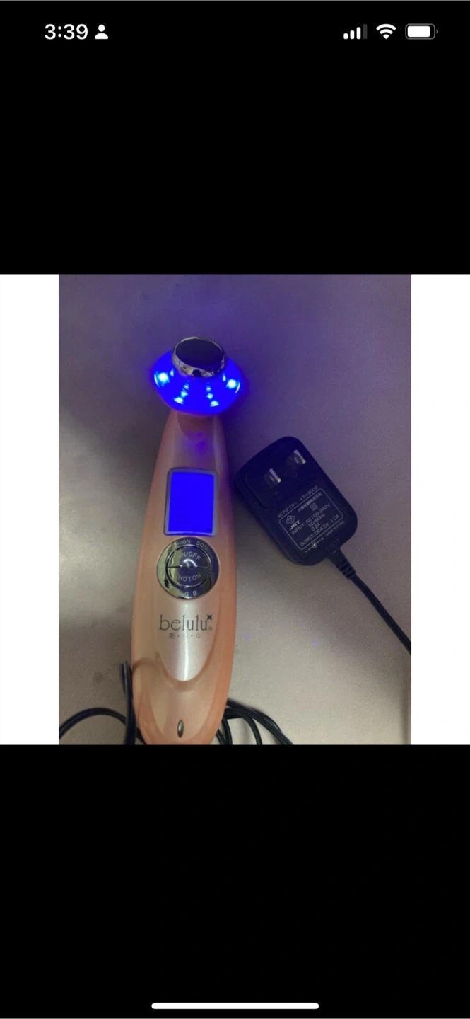 本体と充電コードのセットです。 お手持ちの美容液とご一緒にいかがでしょうか? ニキビ、ハリ、しみに向けた3色の光や浸透しやすくする振動、イオン導入など たくさんの機能が入っております。 説明書などはないため、使用方法はbeluluのサイトをご覧下さいませ。 よろしくお願いします。