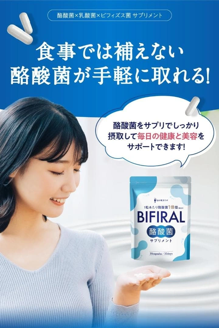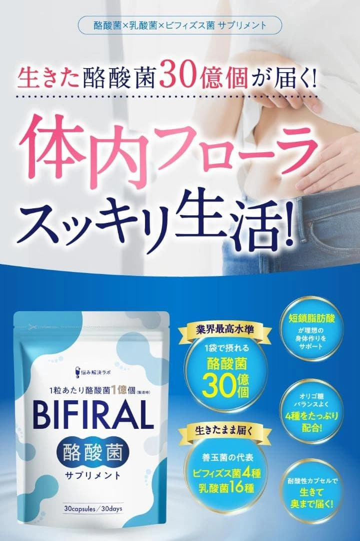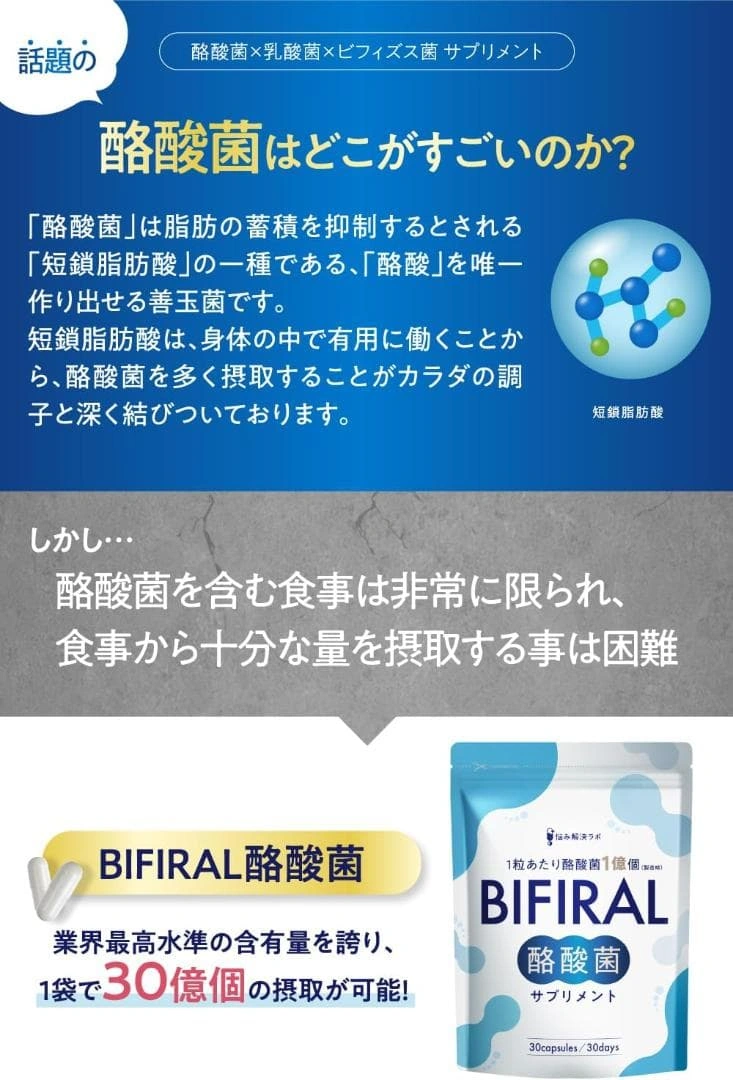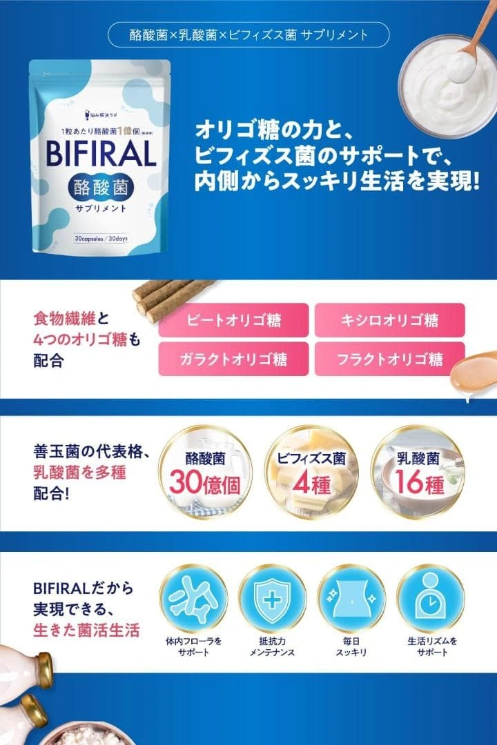 ご覧いただきありがとうございます。 【生きた酪酸菌 30億個贅沢配合】 ビフィラル 酪酸菌 サプリ 酪酸菌 30億個 30日分 乳酸菌 ビフィズス菌 国内製造 菌活 オリゴ糖 イヌリン プロバイオティクス BIFIRAL 賞味期限:2027.06 【1袋で30億個の生きた酪酸菌が届く】 BIFRAL酪酸菌サプリメントは、酪酸菌・乳酸菌・ビフィズス菌・オリゴ糖を贅沢配合し、1日1粒で体内フローラすっきり生活をサポート。 【善玉菌の代表を贅沢配合】 善玉菌の代表であるビフィズス菌を4種、乳酸菌を16種配合し、「生きた」酪酸菌、「生きた」乳酸菌による生きた菌活を推奨します。 【なぜ酪酸菌はすごいのか?】 「酪酸菌」は脂肪の蓄積を抑制するとされる「酪酸」を唯一作り出せる善玉菌ですが、普段の食事から十分な量を摂取する事が困難です。 そんな貴重な成分を1袋で30億個も摂取可能です! 【安心の国内GMP認定工場で製造されたBIFIRAL】 BIFIRALは、安心して摂取いただける様、品質管理に徹底的に配慮した国内GMP認定工場で生産されています。 GMP認定は医薬品製造にも適用される厳しい基準を満たした証明であり、品質管理においても万全を期しています。健康志向の方には、是非ともおすすめの商品です。 【耐酸性カプセルを採用】 胃で溶けにくく、生きて奥まで届く『耐酸性カプセル』を採用しています。 一般的なカプセルは胃で溶けやすいため、耐酸性カプセルなら熱や胃酸に弱い菌たちを生きたまま奥まで届けてくれます。 【内容量】 30粒 ご希望の方はお気軽にご連絡ください。