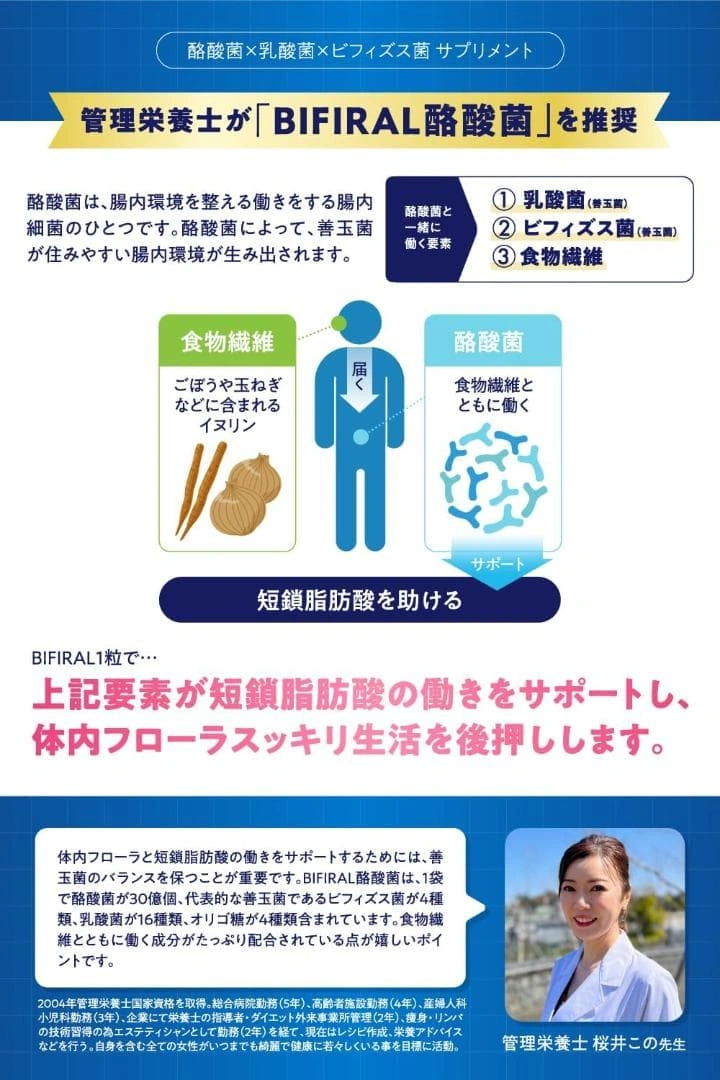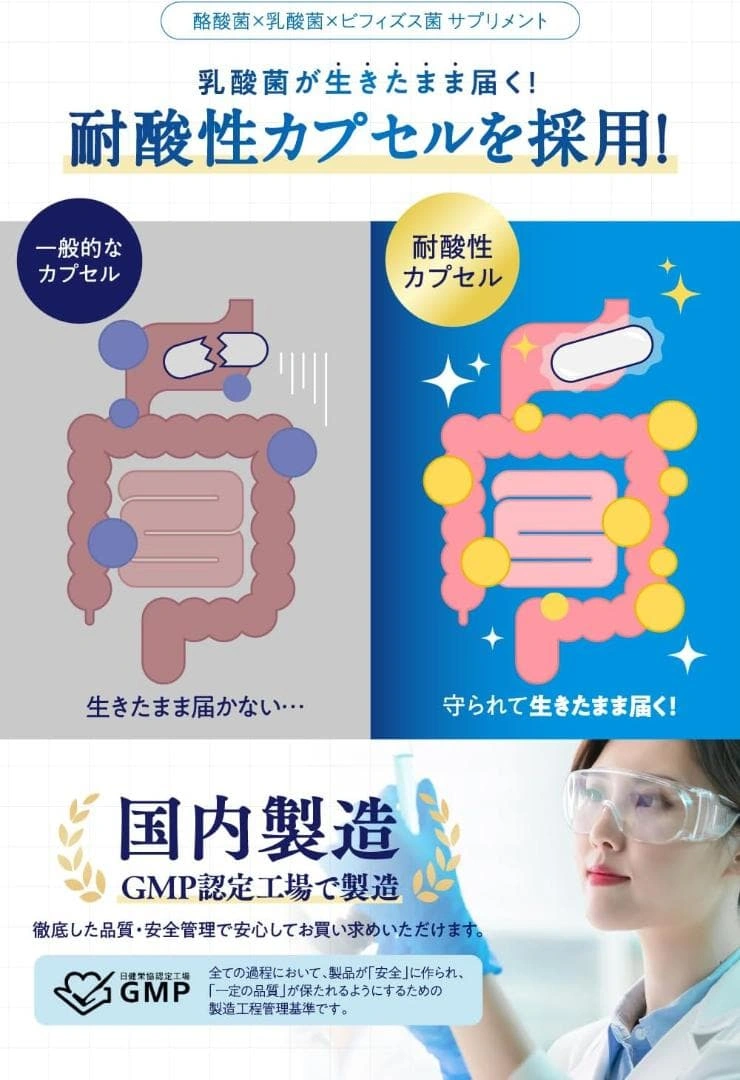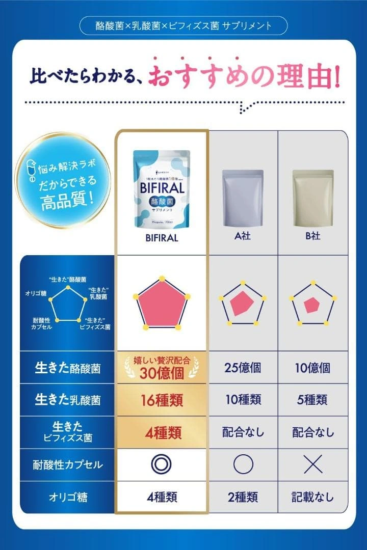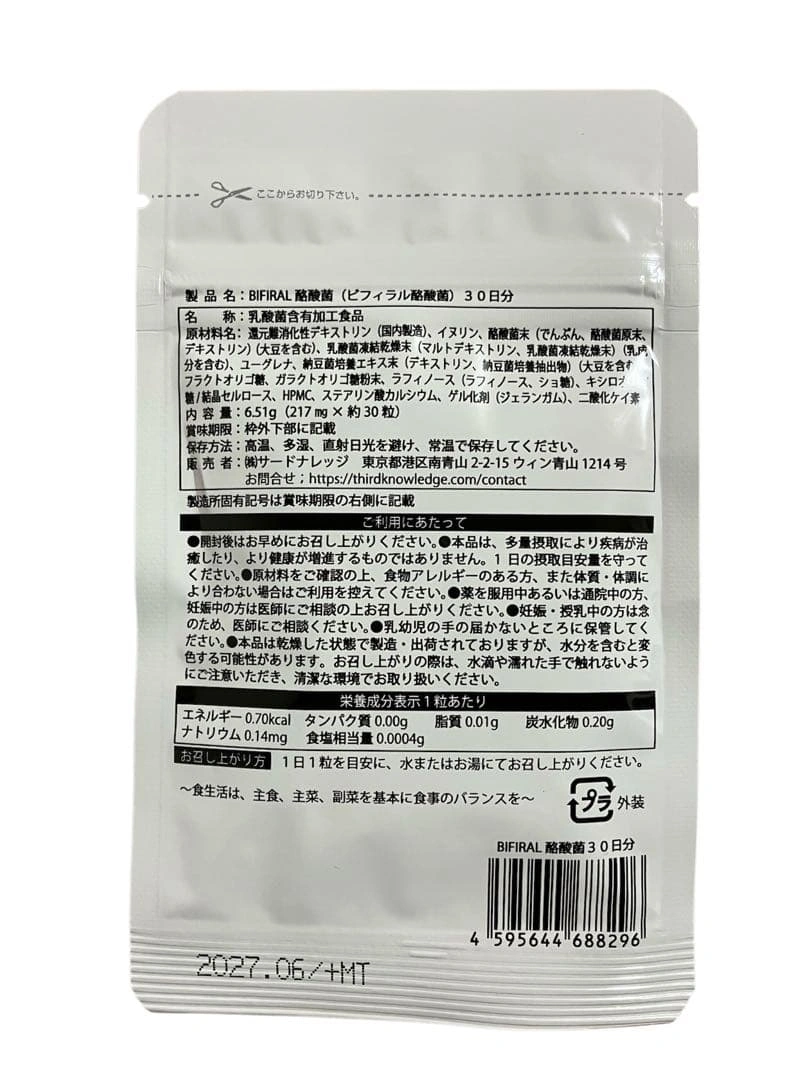 ご覧いただきありがとうございます。 【生きた酪酸菌 30億個贅沢配合】 ビフィラル 酪酸菌 サプリ 酪酸菌 30億個 30日分 乳酸菌 ビフィズス菌 国内製造 菌活 オリゴ糖 イヌリン プロバイオティクス BIFIRAL 賞味期限:2027.06 【1袋で30億個の生きた酪酸菌が届く】 BIFRAL酪酸菌サプリメントは、酪酸菌・乳酸菌・ビフィズス菌・オリゴ糖を贅沢配合し、1日1粒で体内フローラすっきり生活をサポート。 【善玉菌の代表を贅沢配合】 善玉菌の代表であるビフィズス菌を4種、乳酸菌を16種配合し、「生きた」酪酸菌、「生きた」乳酸菌による生きた菌活を推奨します。 【なぜ酪酸菌はすごいのか?】 「酪酸菌」は脂肪の蓄積を抑制するとされる「酪酸」を唯一作り出せる善玉菌ですが、普段の食事から十分な量を摂取する事が困難です。 そんな貴重な成分を1袋で30億個も摂取可能です! 【安心の国内GMP認定工場で製造されたBIFIRAL】 BIFIRALは、安心して摂取いただける様、品質管理に徹底的に配慮した国内GMP認定工場で生産されています。 GMP認定は医薬品製造にも適用される厳しい基準を満たした証明であり、品質管理においても万全を期しています。健康志向の方には、是非ともおすすめの商品です。 【耐酸性カプセルを採用】 胃で溶けにくく、生きて奥まで届く『耐酸性カプセル』を採用しています。 一般的なカプセルは胃で溶けやすいため、耐酸性カプセルなら熱や胃酸に弱い菌たちを生きたまま奥まで届けてくれます。 【内容量】 30粒 ご希望の方はお気軽にご連絡ください。